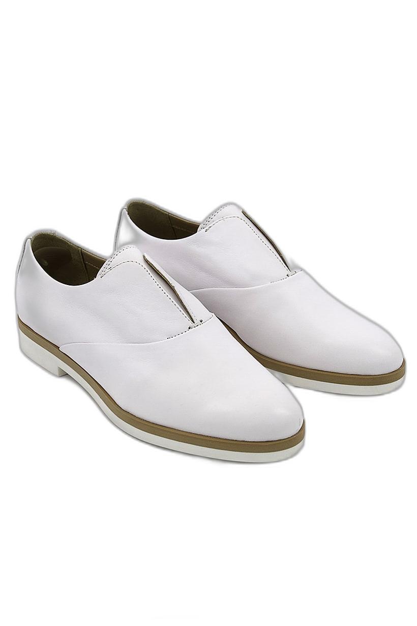 This product features a closed-toe design with a synthetic leather material in a white color family. It has a slip-on closure and a standard shoe width. The insole is lightly padded for added comfort, and the sole is made of synthetic material. This shoe is perfect for women who prefer a no-heel style.
