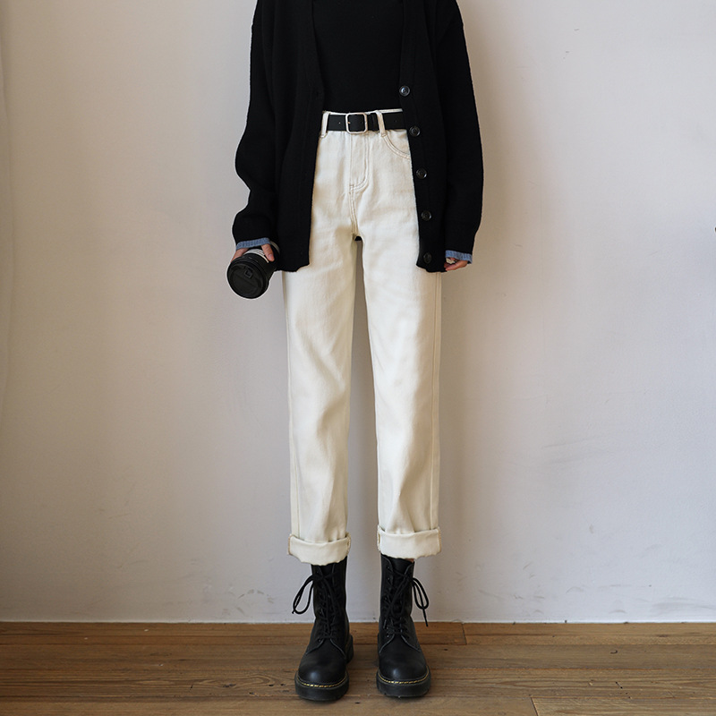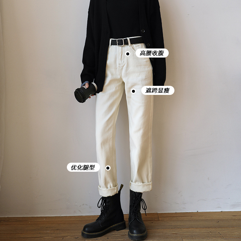 | nameOriginal | White jeans women's straight loose 2023 autumn and winter New fleece-lined small beige wide-leg daddy pants |