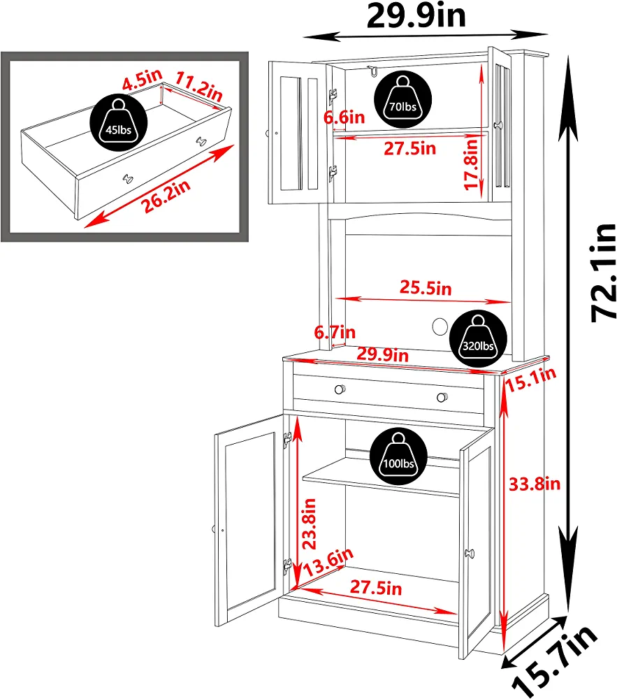This kitchen pantry cabinet offers three adjustable shelves that can be customized to fit your needs. The clear glass doors provide a stylish display of your stored items. The upgraded metal handles and hinges ensure a smooth and enjoyable experience when using the cabinet. The large central drawer with metal handles allows for easy organization, and the cable management hole in the back panel allows for convenient placement of appliances. The cabinet is made of sturdy engineered wood and coated with an eco-friendly white finish for durability. The anti-tip system adds extra security, and the modern design makes it a great addition to any room. The overall dimensions are 29.9”W x 15.7”D x 72.1”H, with a depth of countertop at 14.8” and adjustable shelf range of 1.18”.