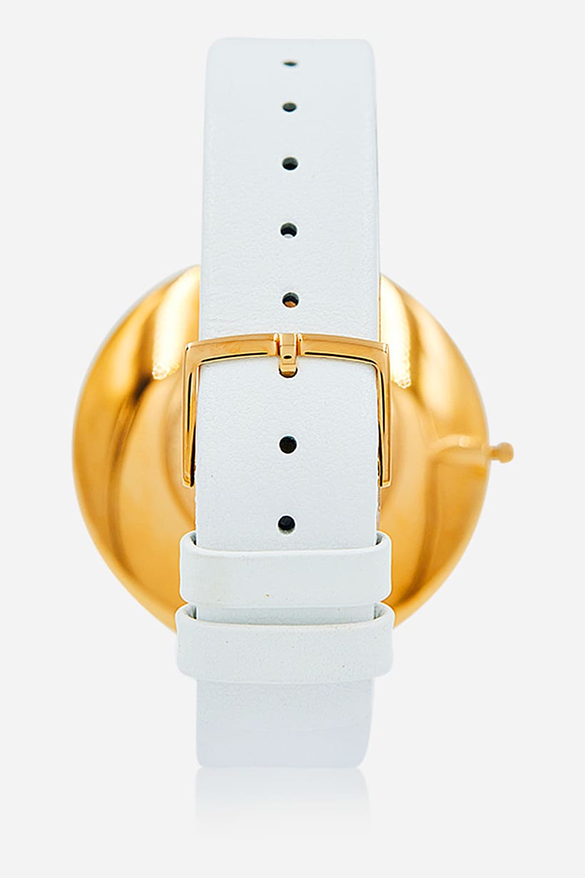 This product features a round dial with a glass window and does not have a display. It is an ideal gift for women and comes with a white leather strap that is secured with a buckle closure. The watch has an analog display and a white dial, making it a great addition to any white-themed outfit.