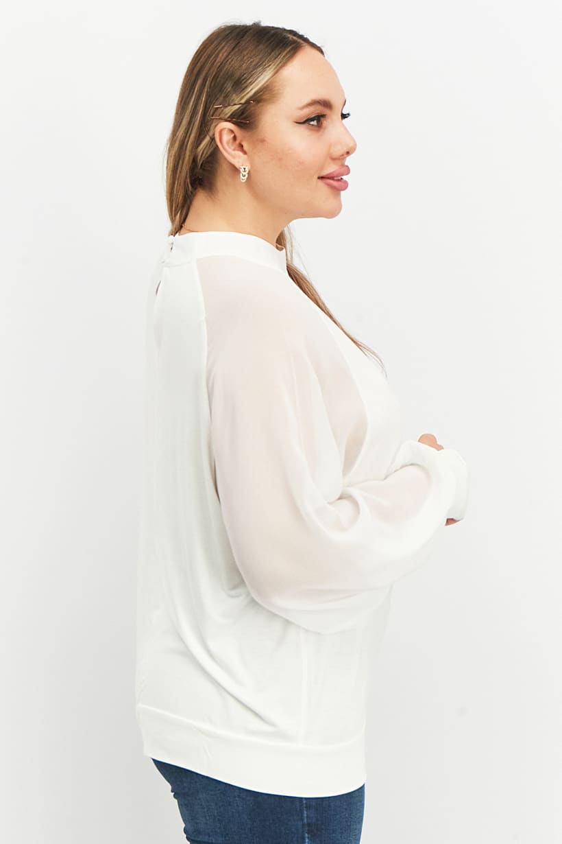 This blouse has a regular fit and a mock neckline with long sleeves. It is made of 95% viscose and 5% elastane, and has a straight hem with a pullover or button closure. The color of the product may vary slightly due to lighting or monitor settings. It is a solid white color and is suitable for casual occasions. The size shown is international.