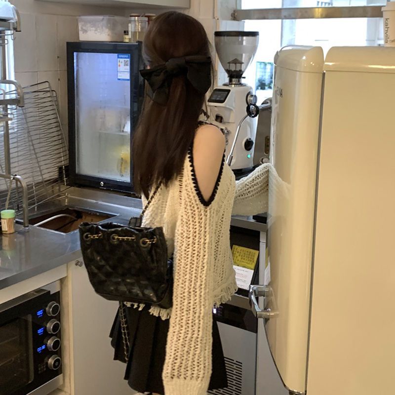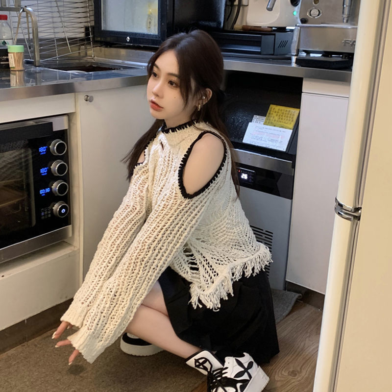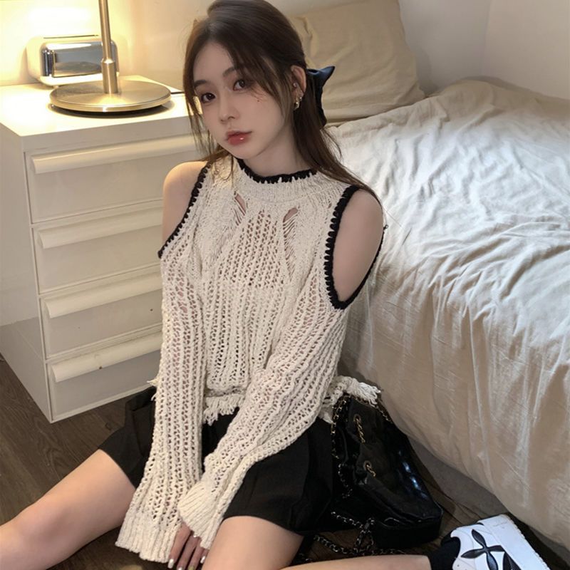 | nameOriginal | White Long-Sleeved Off-Shoulder Hollow Knitted Sweater Women's Summer Thin Short High-Waist Fashionable Western-Style Loose High-end Top |