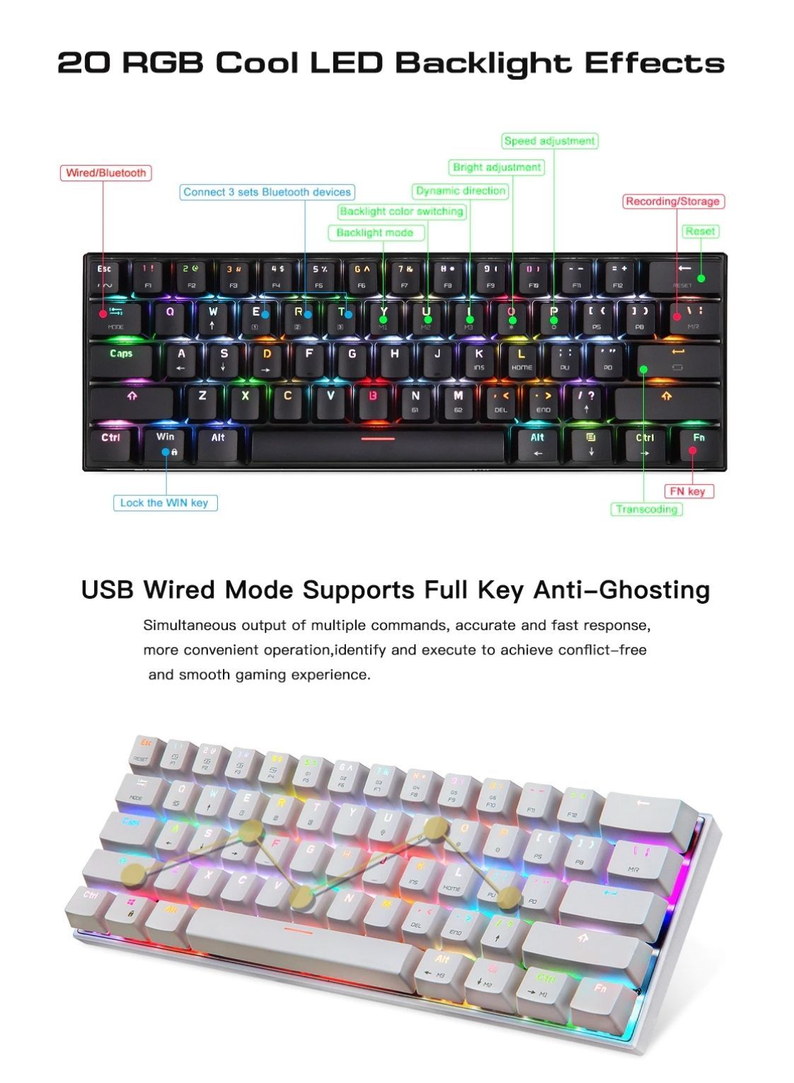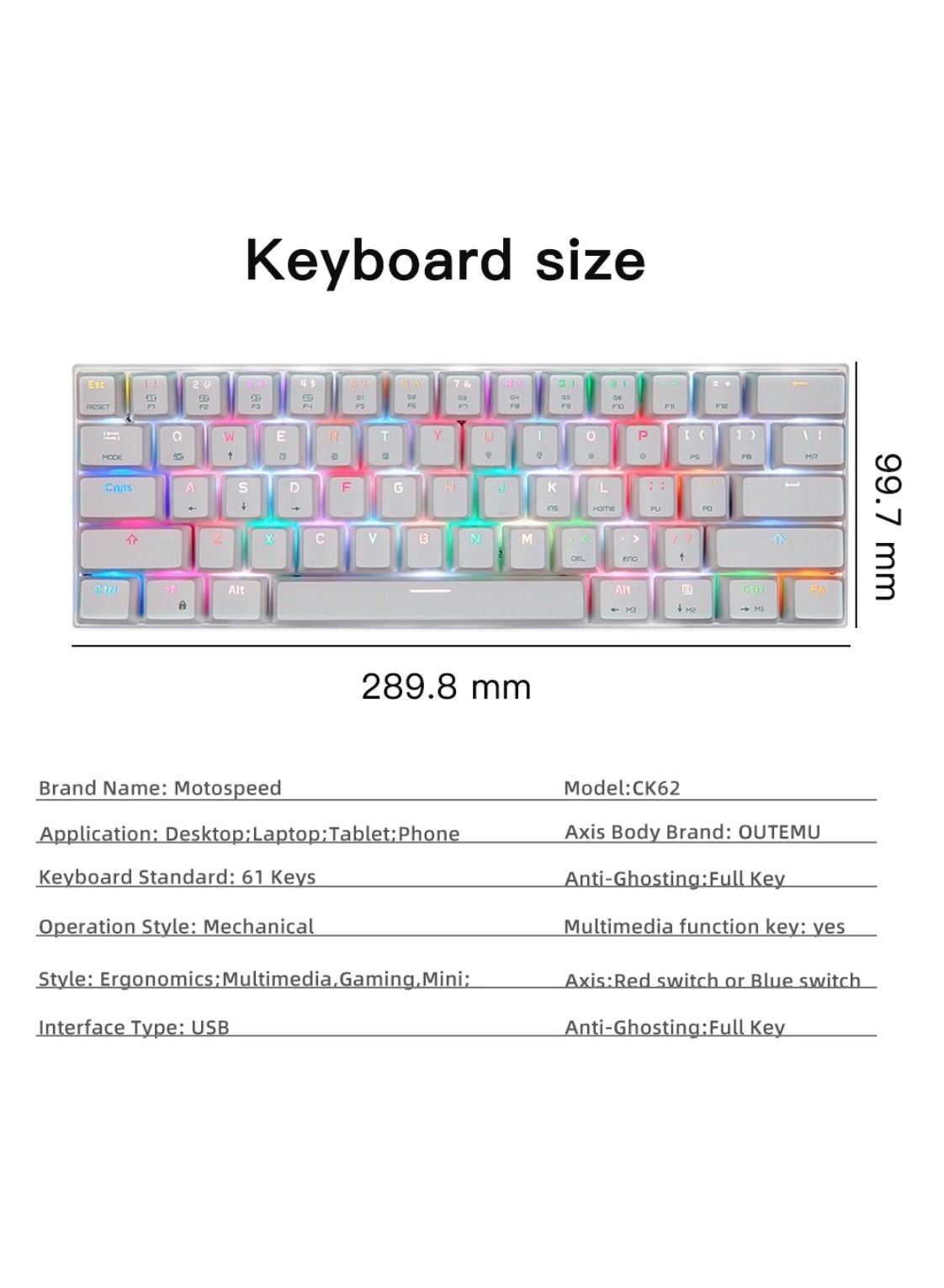 Introducing the RGB Backlight 61-Key Mechanical Gaming Keyboard, the ultimate keyboard for gamers and tech enthusiasts alike. With its sleek and compact design, this keyboard features 61 keys and a white color scheme that will complement any setup. The keyboard is equipped with Outemu Blue Switches, which provide a tactile and audible feedback that is perfect for gaming and typing.