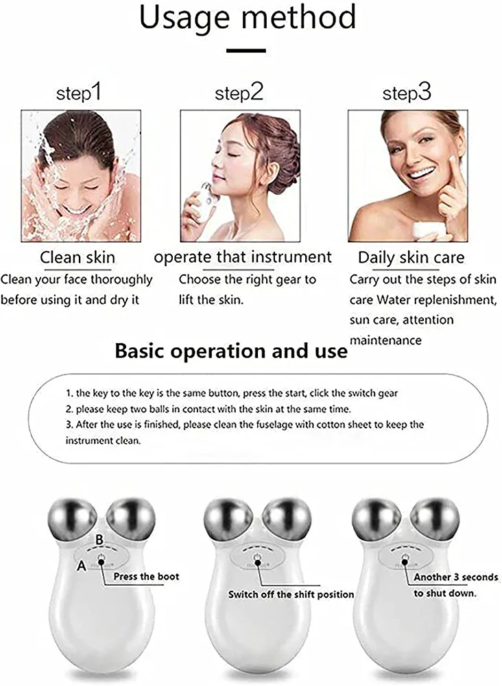 To use, simply clean your skin before use and apply cream, gel, or lotion to the area that needs care. Then, operate the device and feel the gentle microcurrent without any vibration. After finishing, wipe off the cream, gel, or lotion and continue with your daily skin care routine. It can be used every day for 3-5 minutes each time, but not more than twice a day.