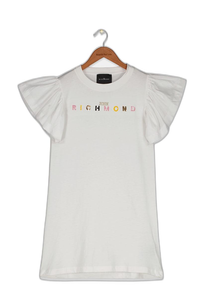 This product is suitable for girls and can be easily cared for by machine washing. It features a crew neckline with ruffle sleeves and a straight hem. Made from 100% cotton lawn, it is perfect for casual occasions and comes in a white color with an embroidered logo. The pullover closure adds convenience to the design.