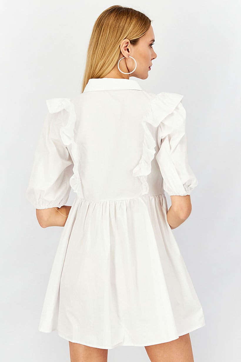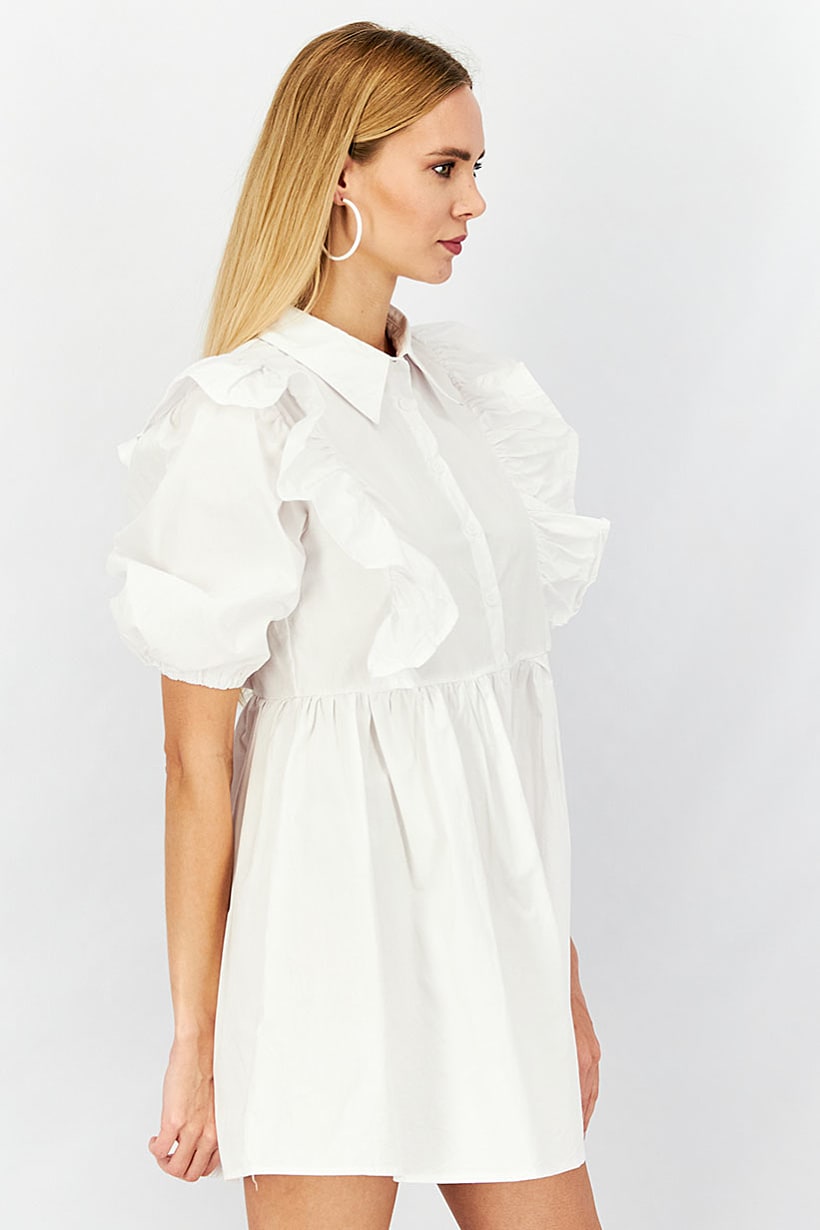 | descriptionOriginal | Care : Machine washable, Fit : Regular fit, Size shown : US, Types of Hem : Straight hem, Types of Neckline & Collar : Spread collar , Types of Sleeve : Puffed sleeve , Fabrics : 100% Cotton, Occasion : Casual, Pattern & Print : Plain/Solid, Types of Closures : Button, Color Family : White, Dress Style : Mini, |