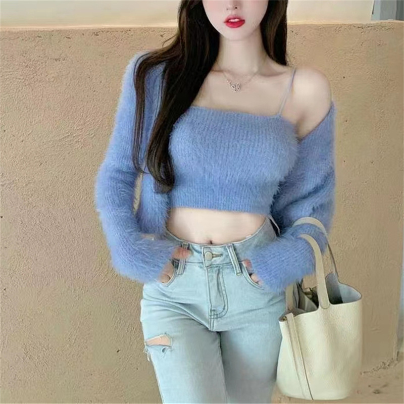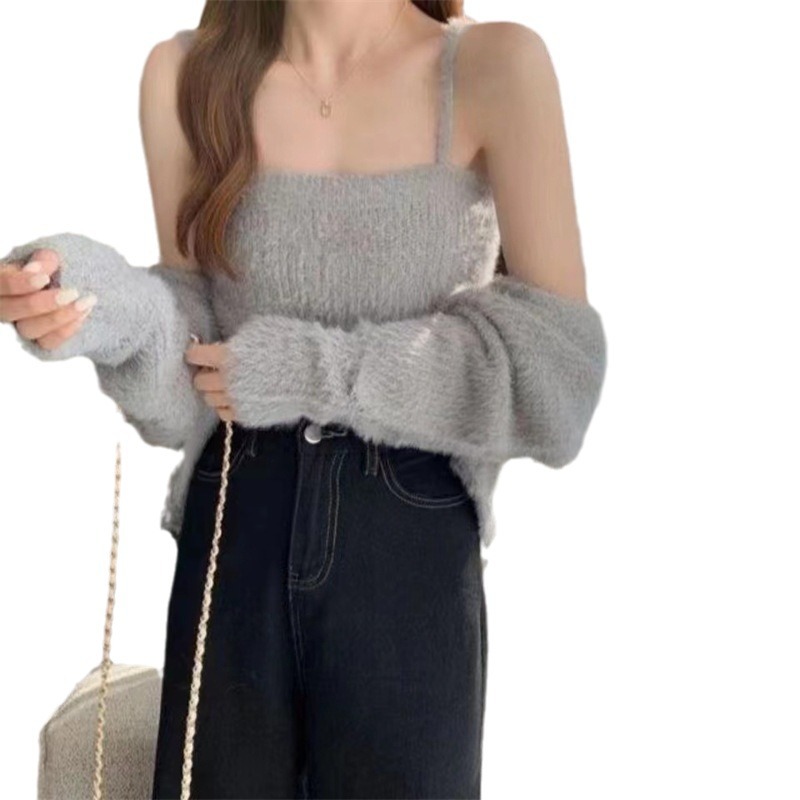 | nameOriginal | White Mink Velvet Sweater Coat Women's 2024 Autumn and Winter Short Sweet Soft Waxy Knitted Cardigan Sling Two-piece Set |