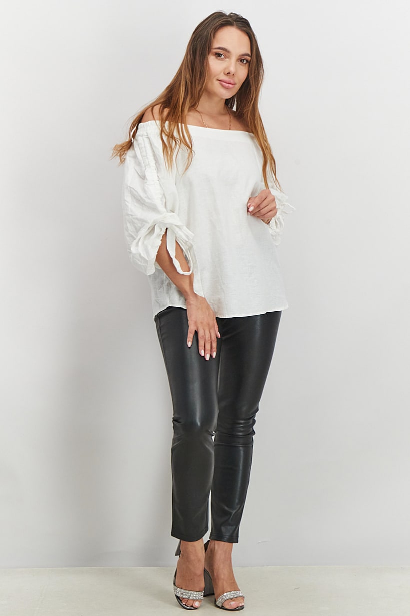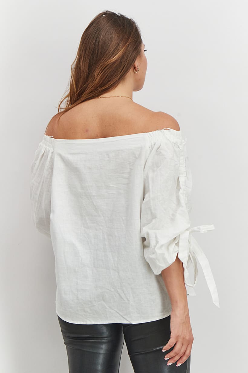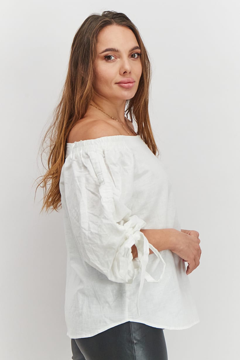 Care : Machine washable, Fit : Regular fit, Size shown : EU, Top Style : Blouse, Types of Hem : Straight hem, Types of Neckline & Collar : Off-shoulder neckline, Types of Sleeve : Puffed sleeve , Disclaimer : Product color may slightly vary due to photographic lighting sources or your monitor settings., Fabrics : 55% Linen, 45% Cotton, Occasion : Casual, Pattern & Print : Plain/Solid, Types of Closures : Pullover, Color Family : White,