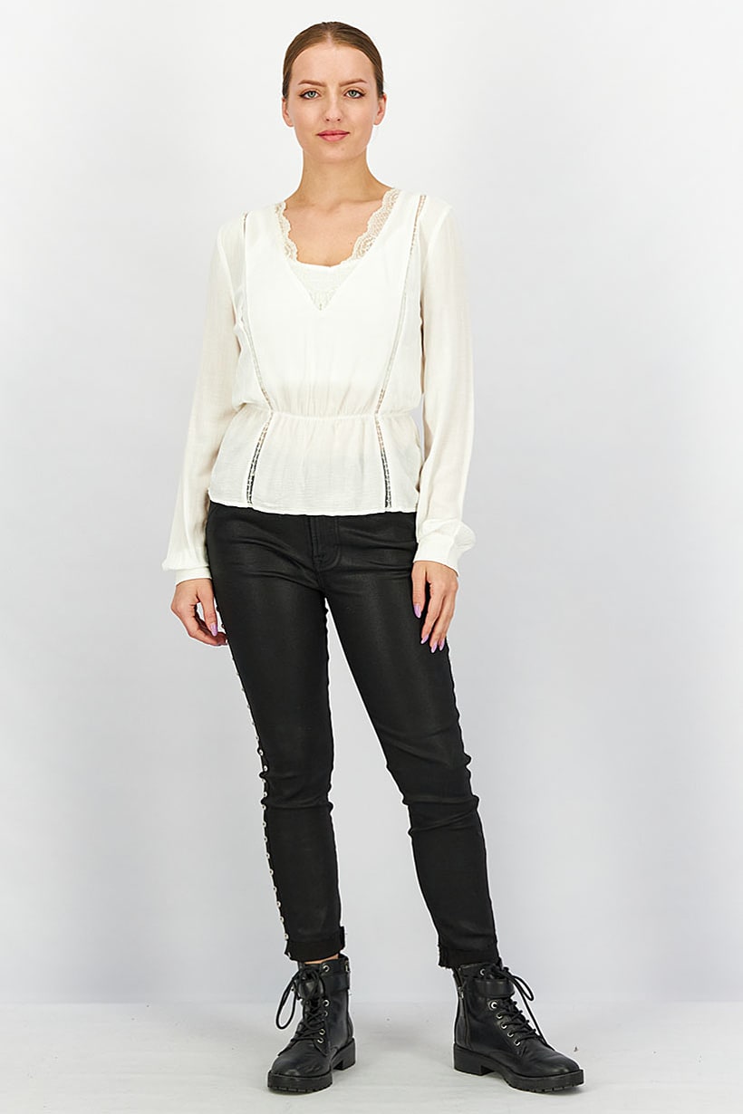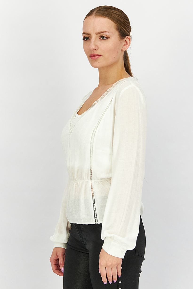 | descriptionOriginal | Care : Machine washable, Fit : Regular fit, Size shown : US, Top Style : Blouse, Types of Hem : Flared hem, Types of Neckline & Collar : V-neckline, Types of Sleeve : Longsleeve, Disclaimer : Product color may slightly vary due to photographic lighting sources or your monitor settings., Fabrics : 100% Cotton, Occasion : Casual, Pattern & Print : Textured pattern, Types of Closures : Pullover, Color Family : White, |
