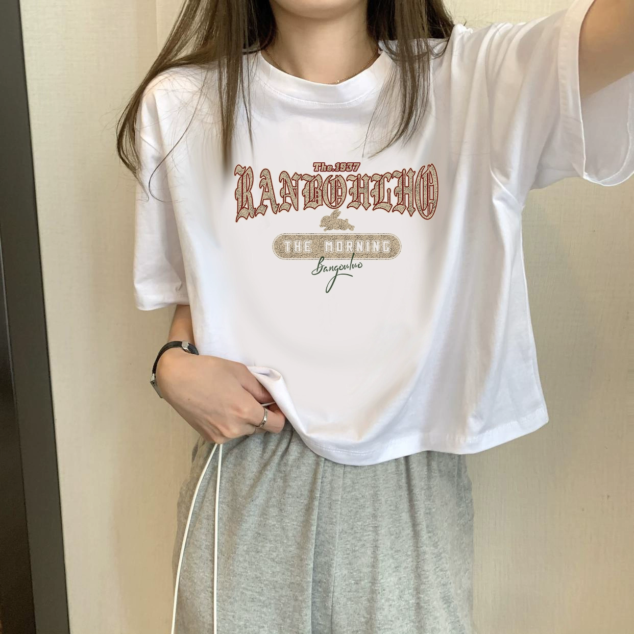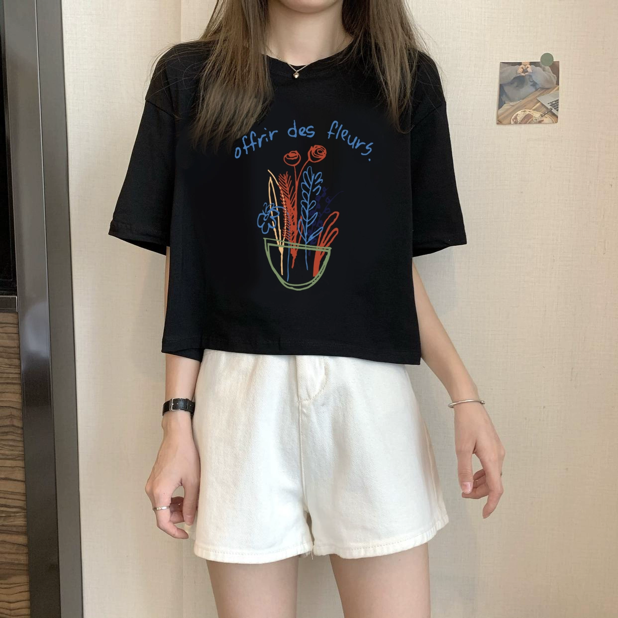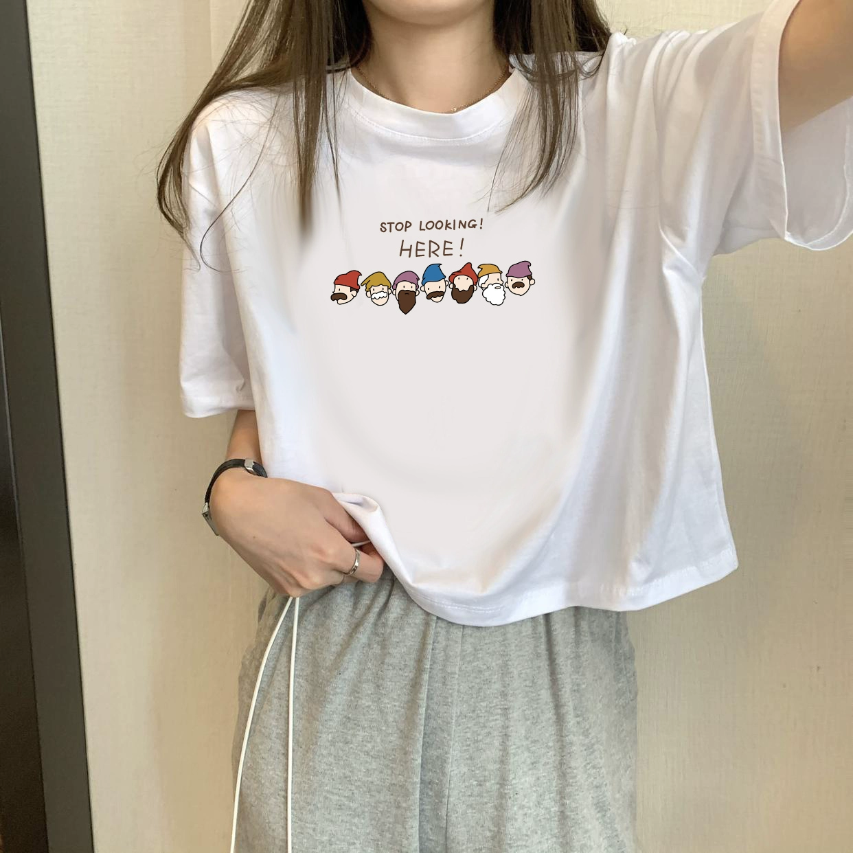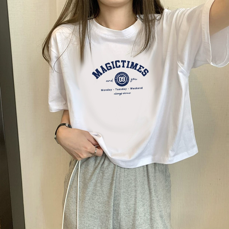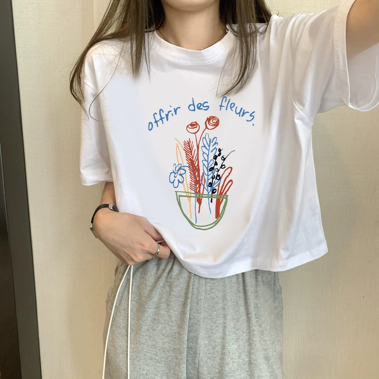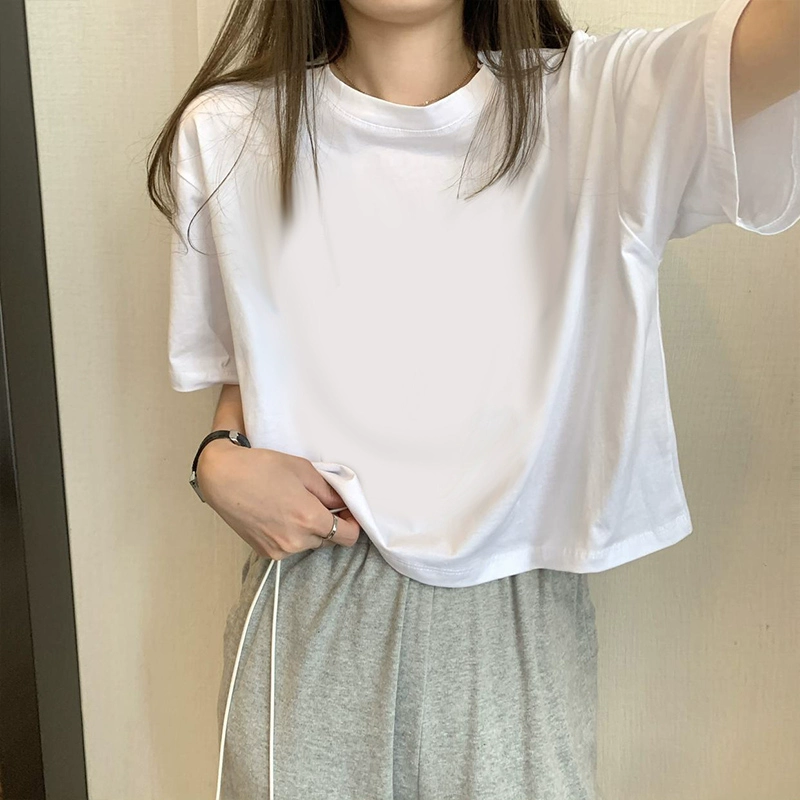 | nameOriginal | White petite high-waisted loose printed top with short sleeves |