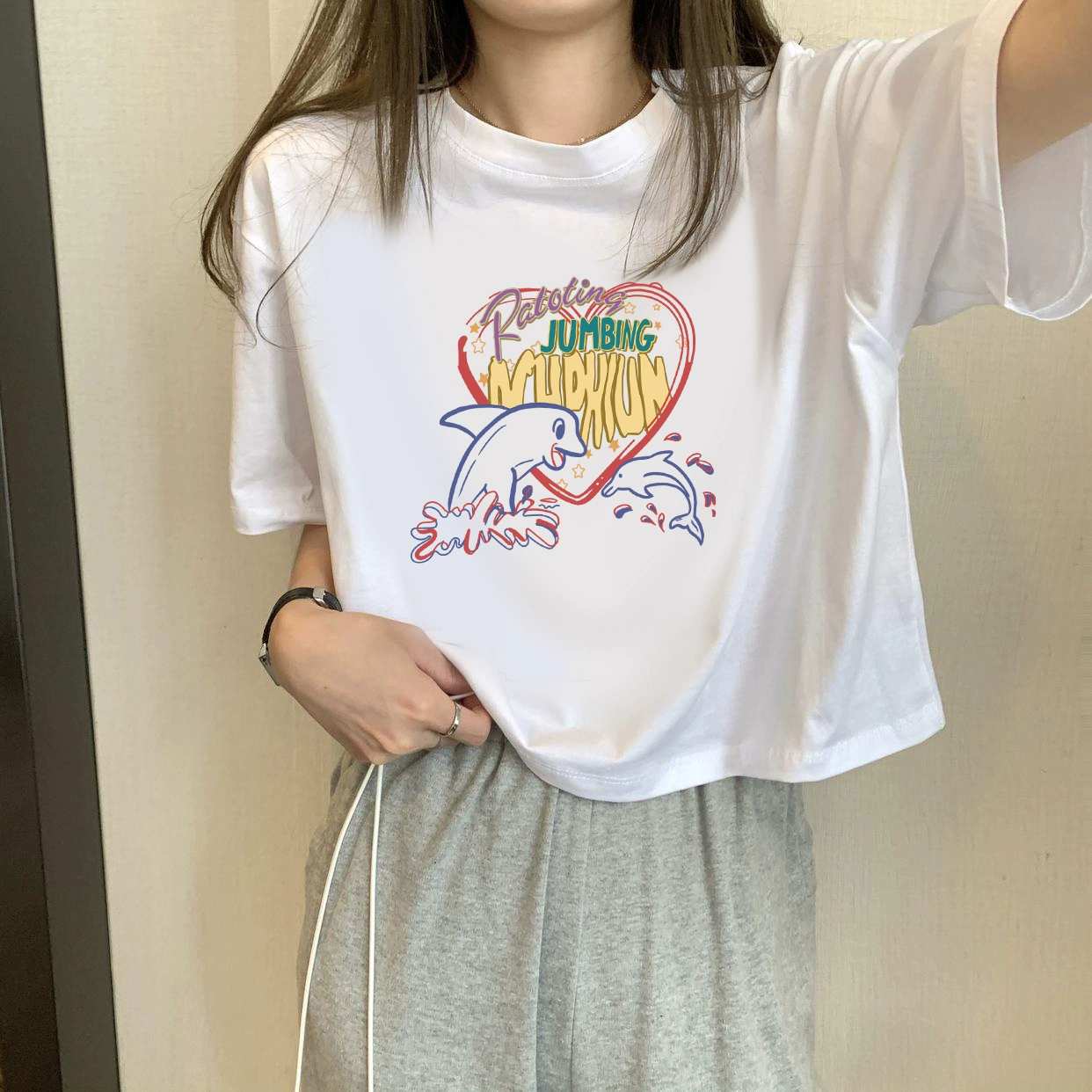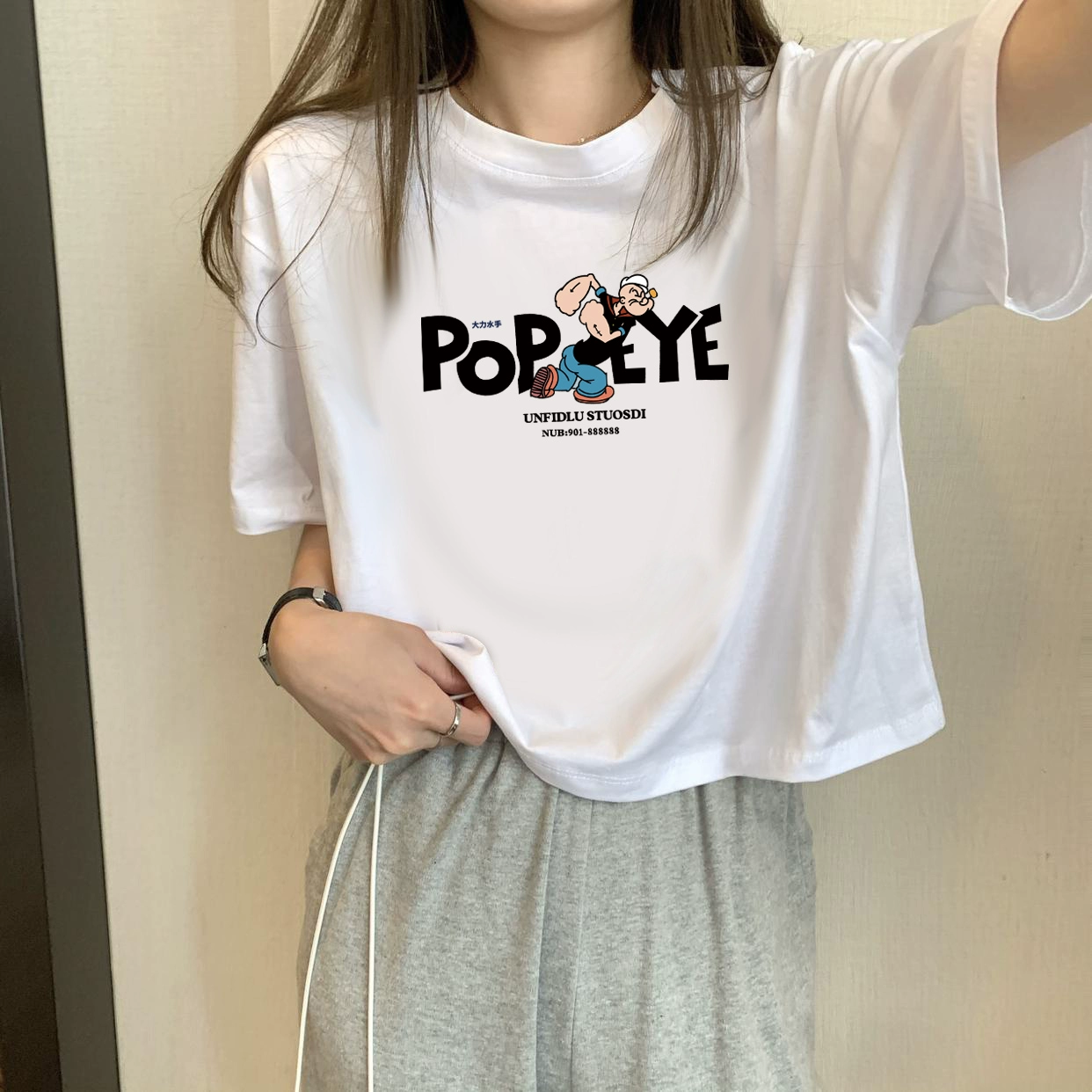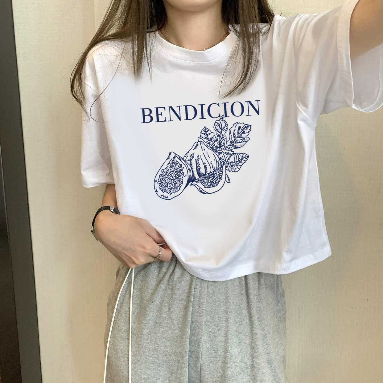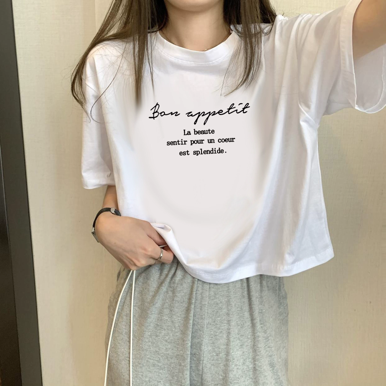 | nameOriginal | White petite high-waisted loose printed top with short sleeves |