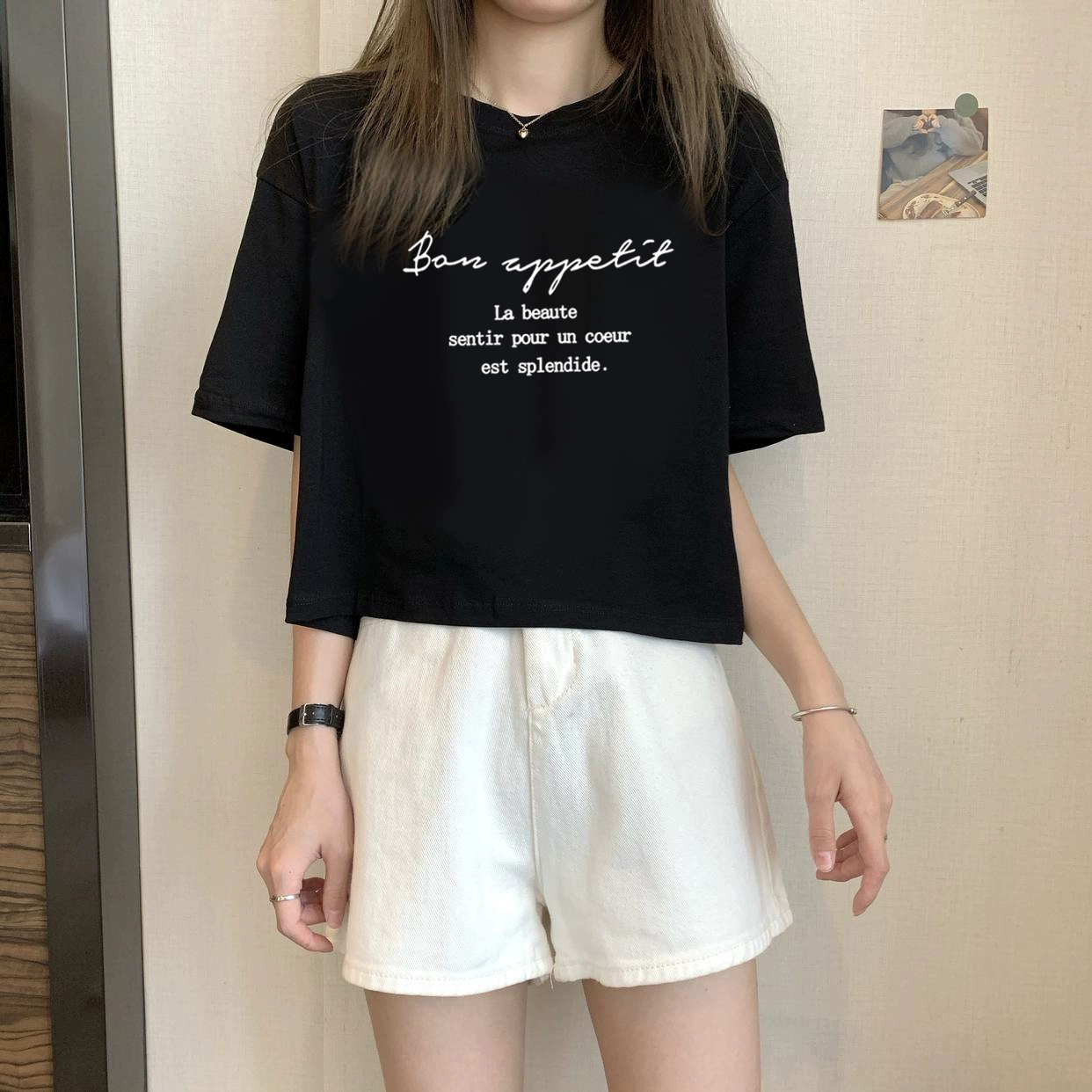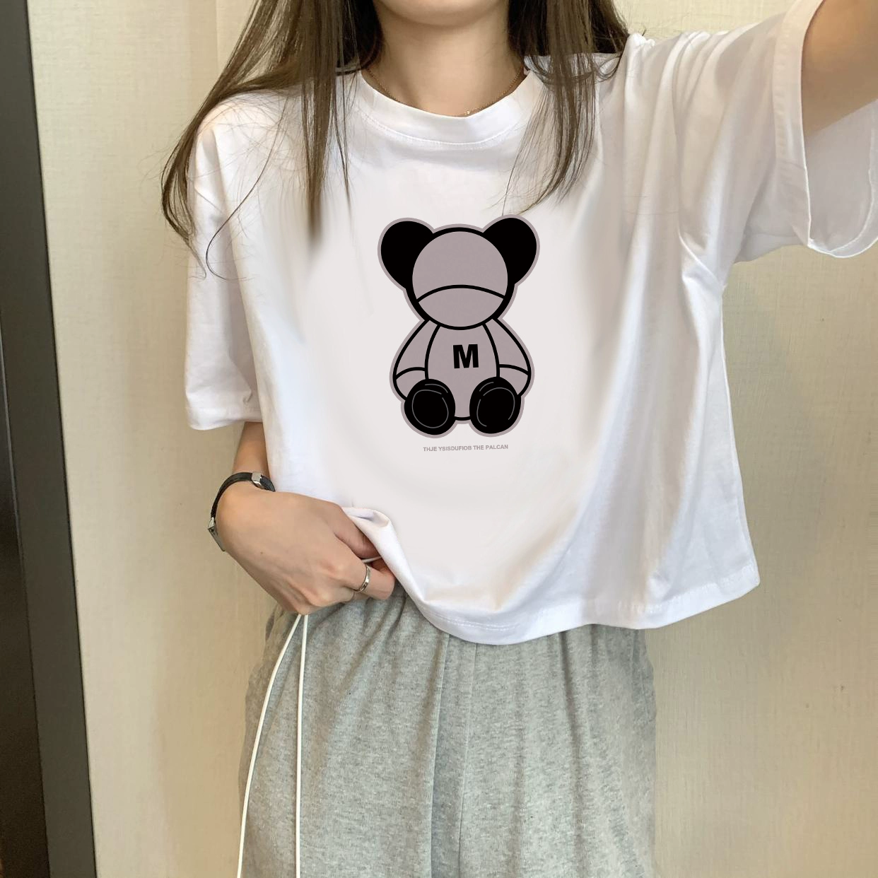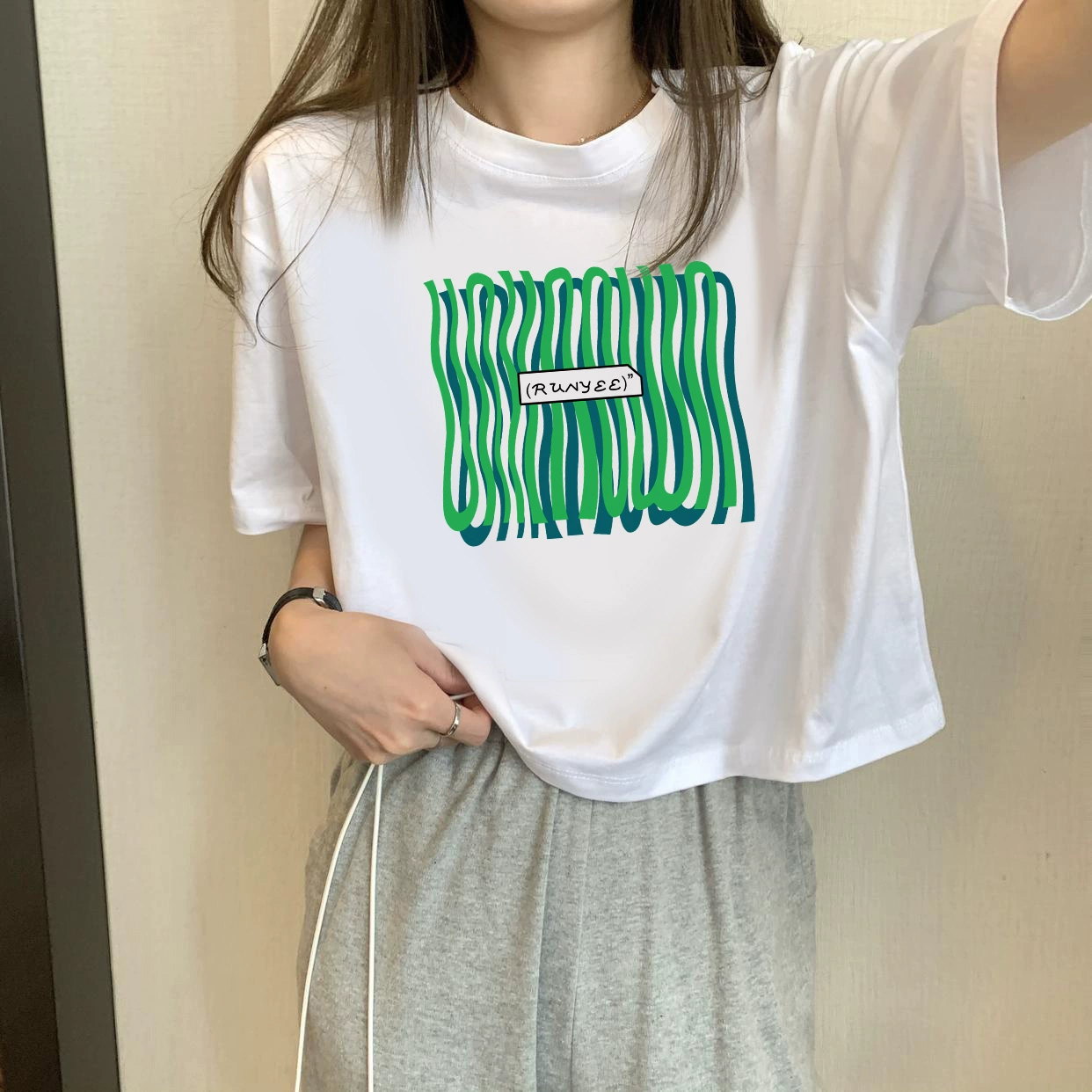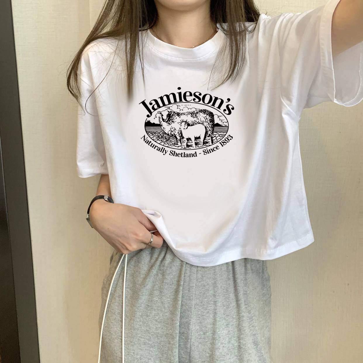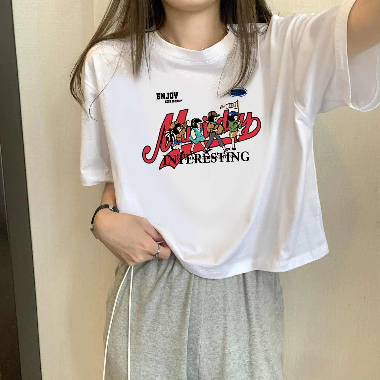 | nameOriginal | White petite high-waisted loose printed top with short sleeves |