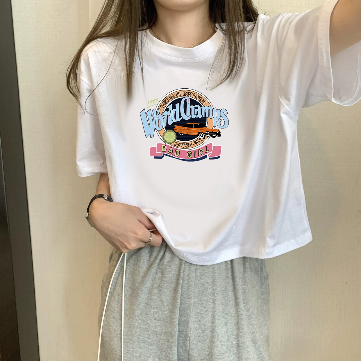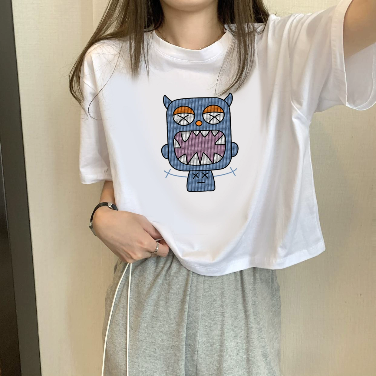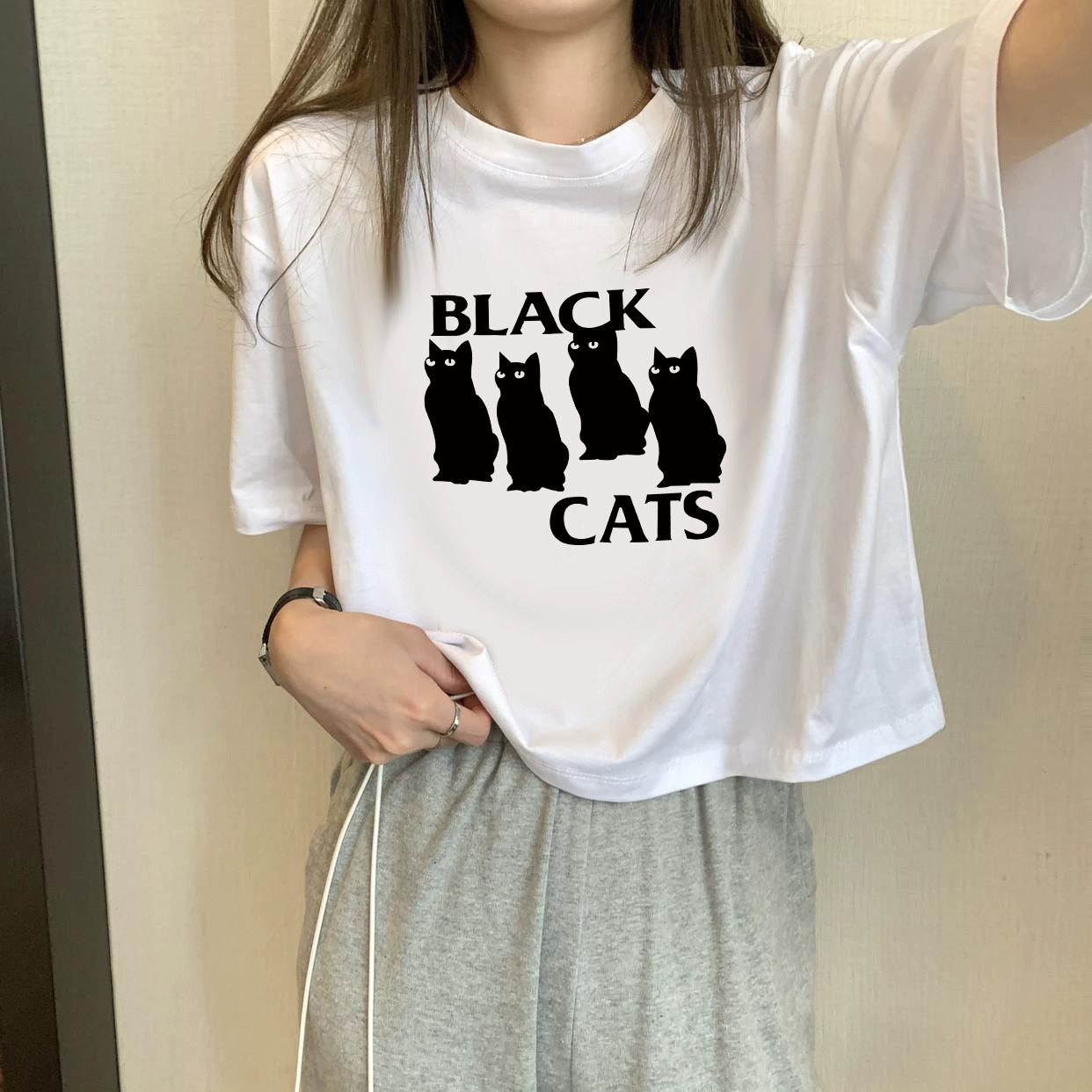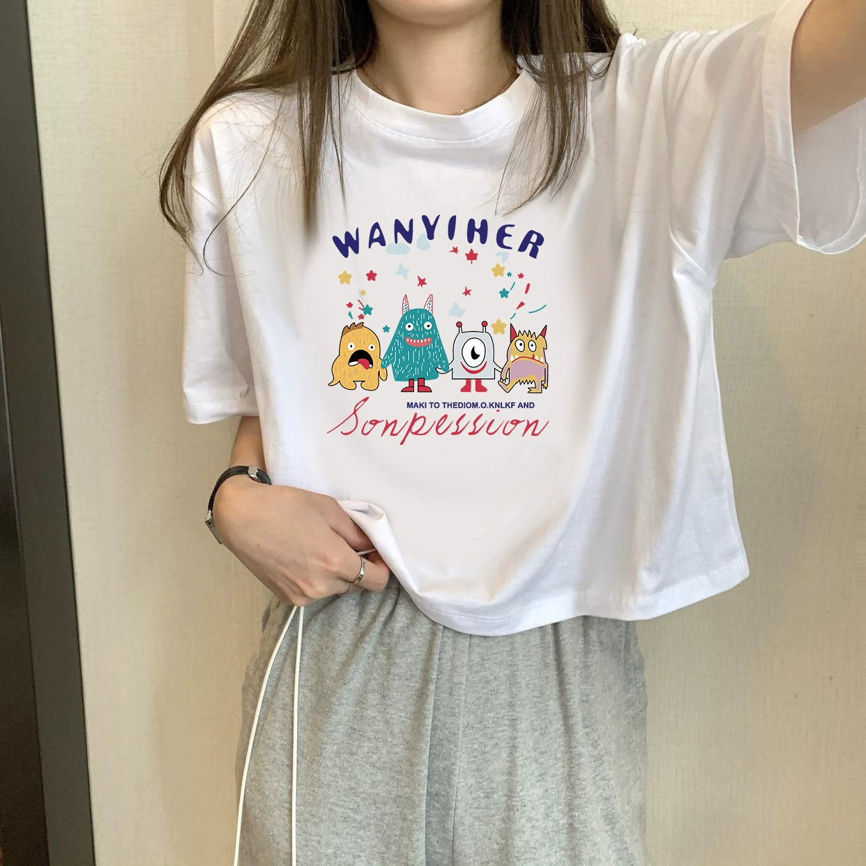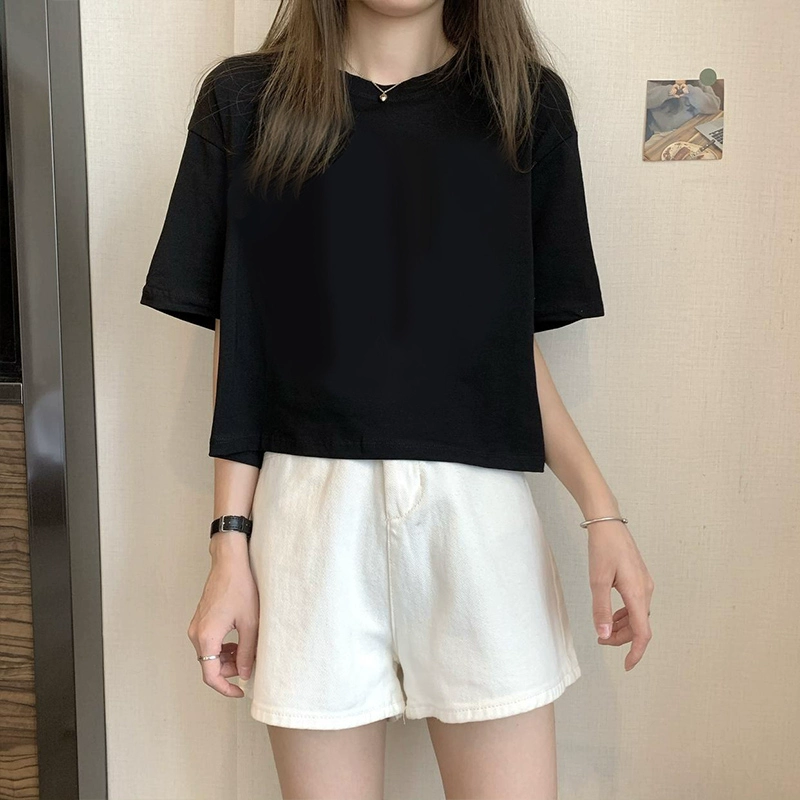 | nameOriginal | White petite high-waisted loose printed top with short sleeves |