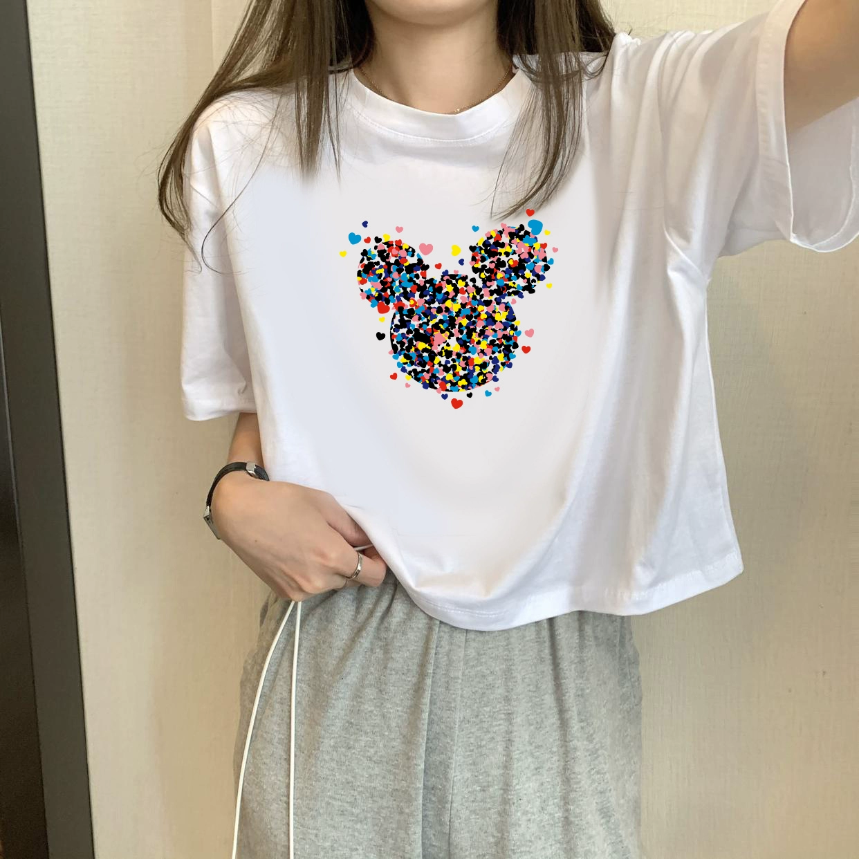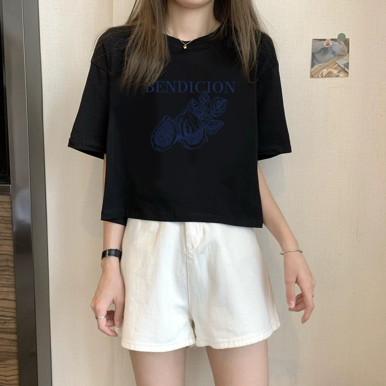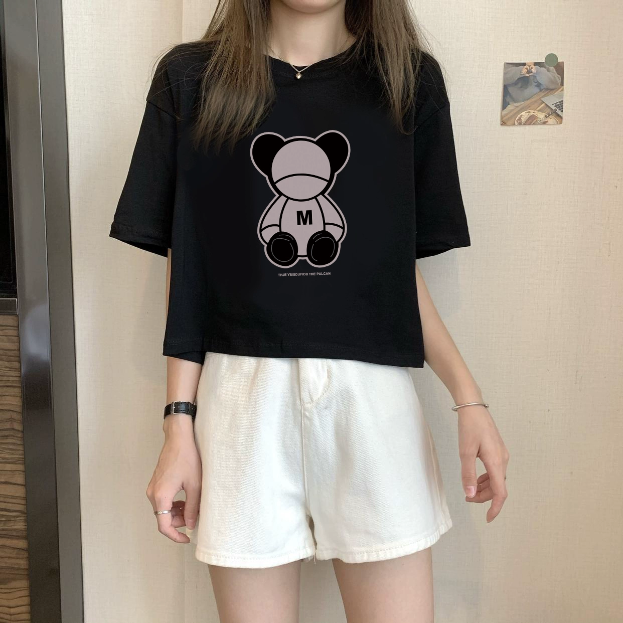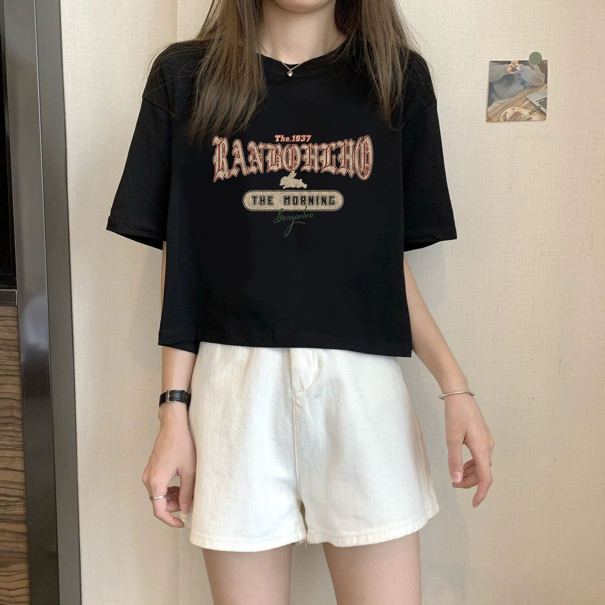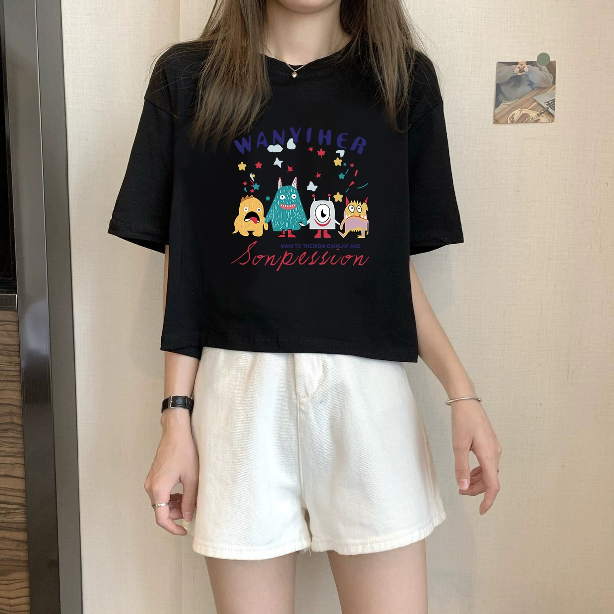 | nameOriginal | White petite high-waisted loose printed top with short sleeves |