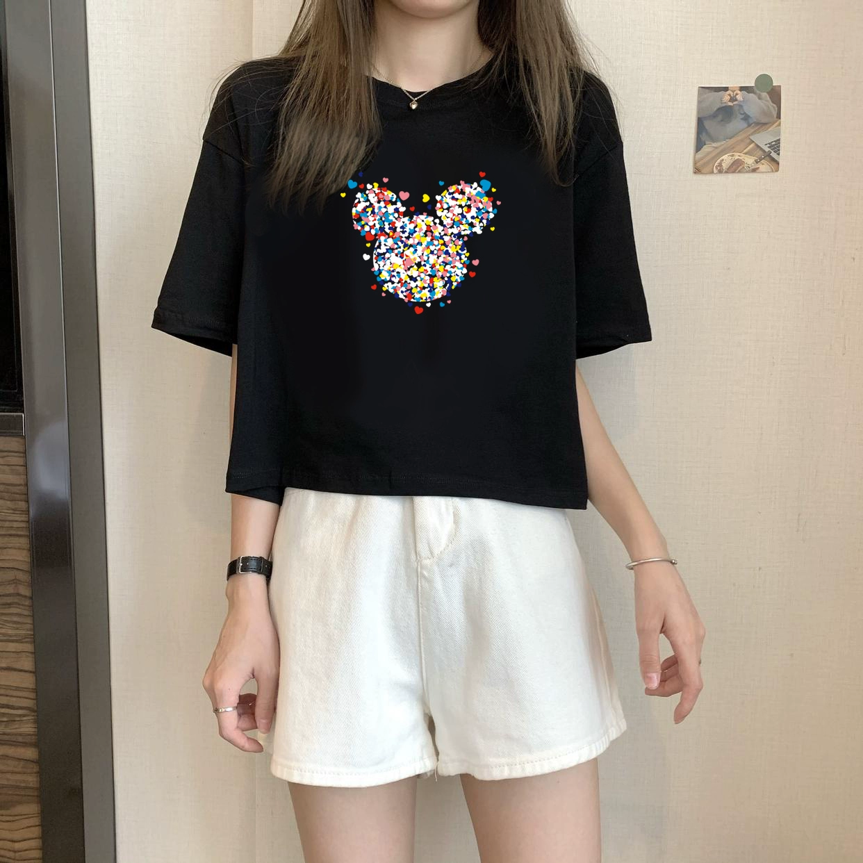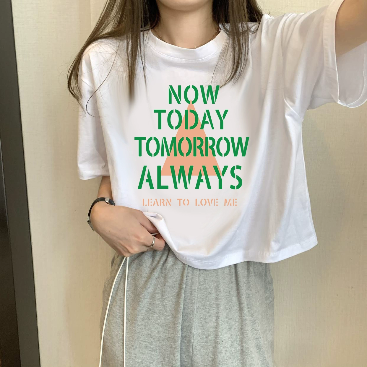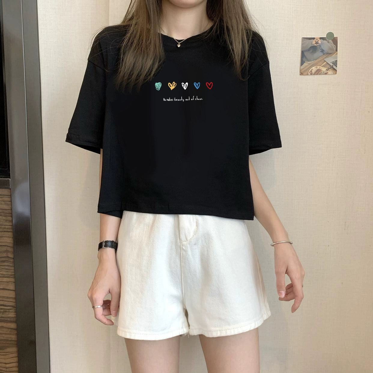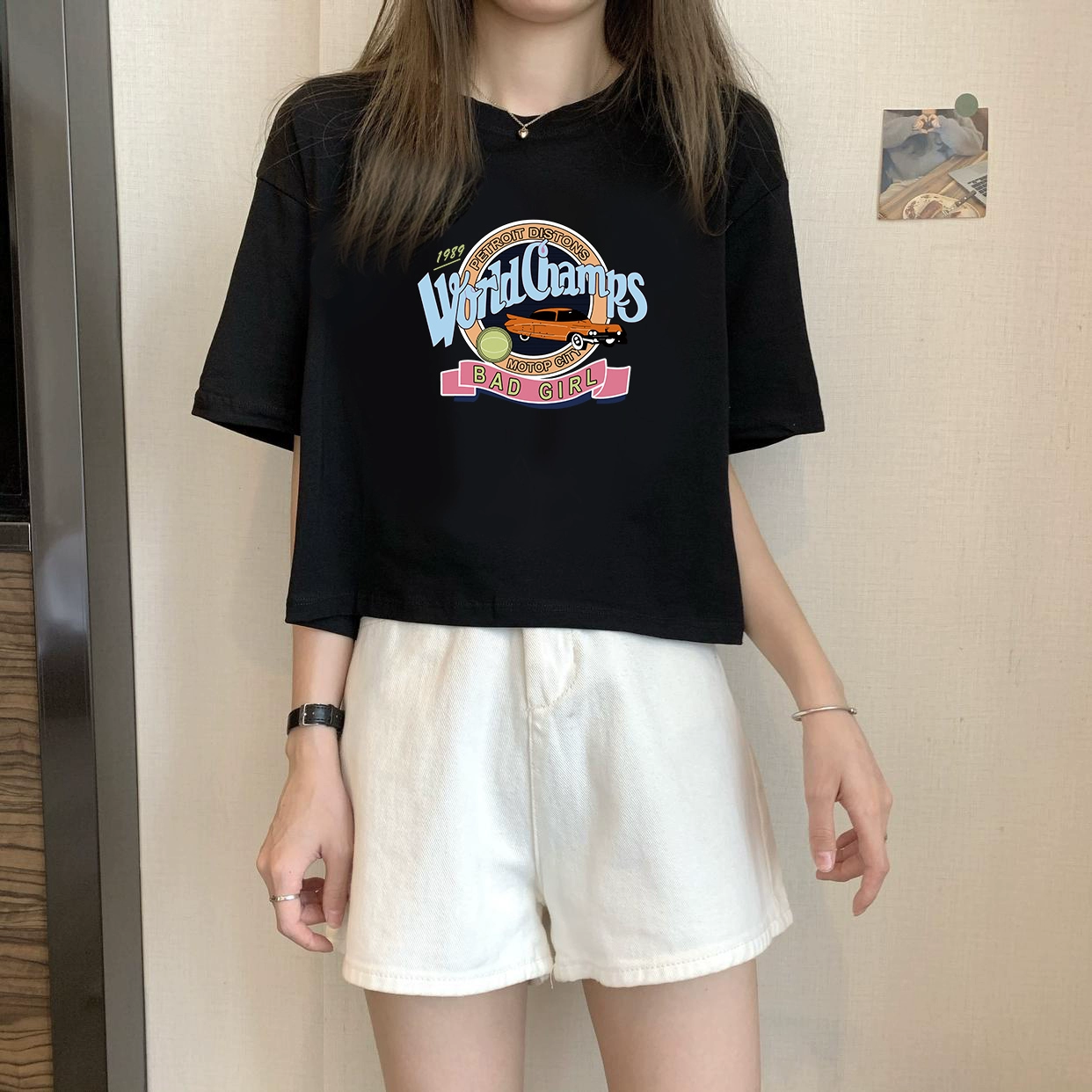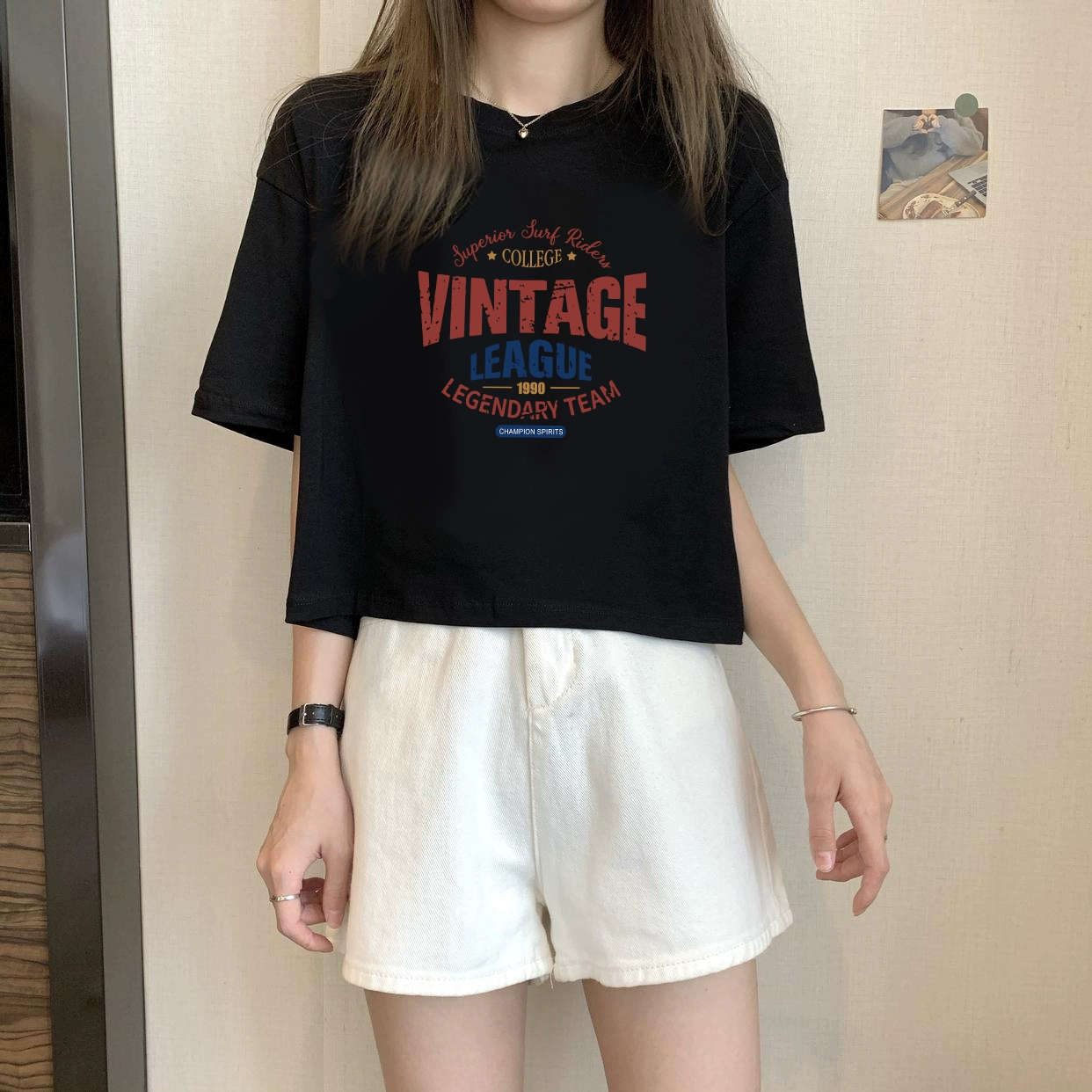 | nameOriginal | White petite high-waisted loose printed top with short sleeves |