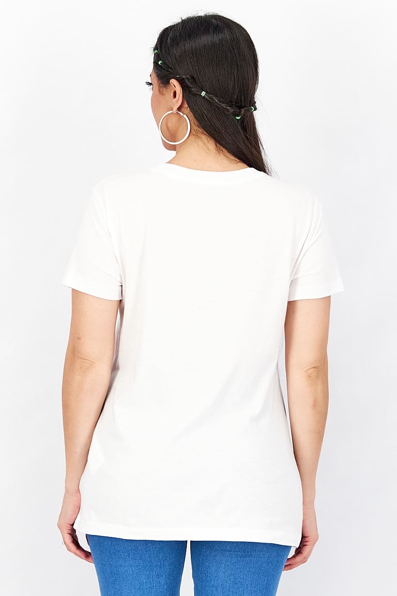 White Printed Short Sleeve T-Shirt with Jewel Neckline for Women.