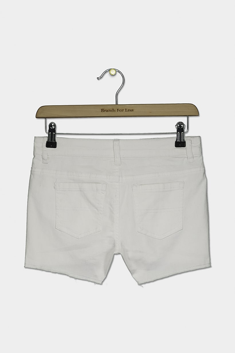 Type of Short : Denim short, Ideal For : Girls, Care : Machine washable, Occasion : Casual, Types of Hem : Distressed hem, Bottom Style/Pattern : Five pocket style, Bottom Closure : Button, Fabrics : 100% Cotton, Color Family : White,