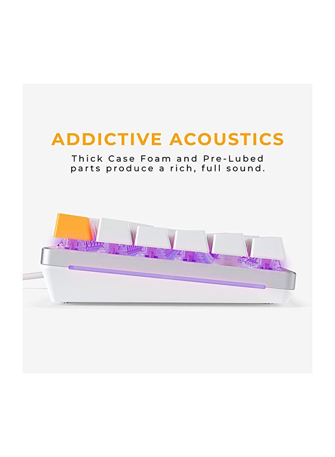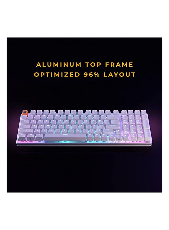 Introducing the latest version of GMMK, which boasts an aluminum top frame that has been anodized to ensure a consistent and long-lasting finish. With eight pre-installed effects, it can be fully customized to suit your preferences and complement your setup. The addition of sleek sidelights adds a unique touch to its appearance. You can easily plug in your preferred switch type without requiring any tools, and the metal switch plate ensures that they remain securely in place. The clear switches allow vibrant light to shine through, reflecting off the metal plate. The lighting effects can be customized to your liking, making it an incredibly versatile product.