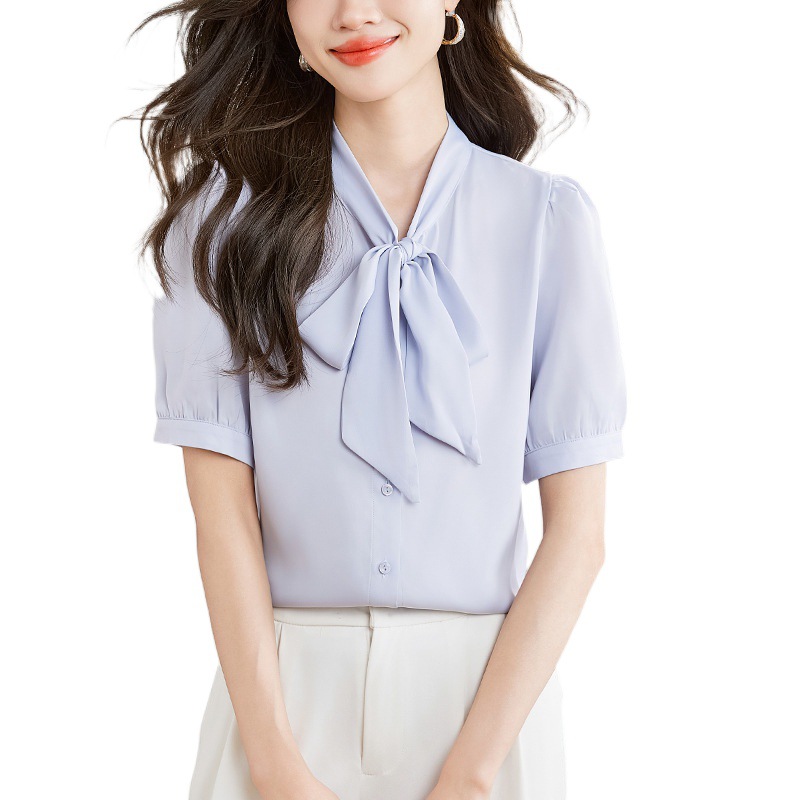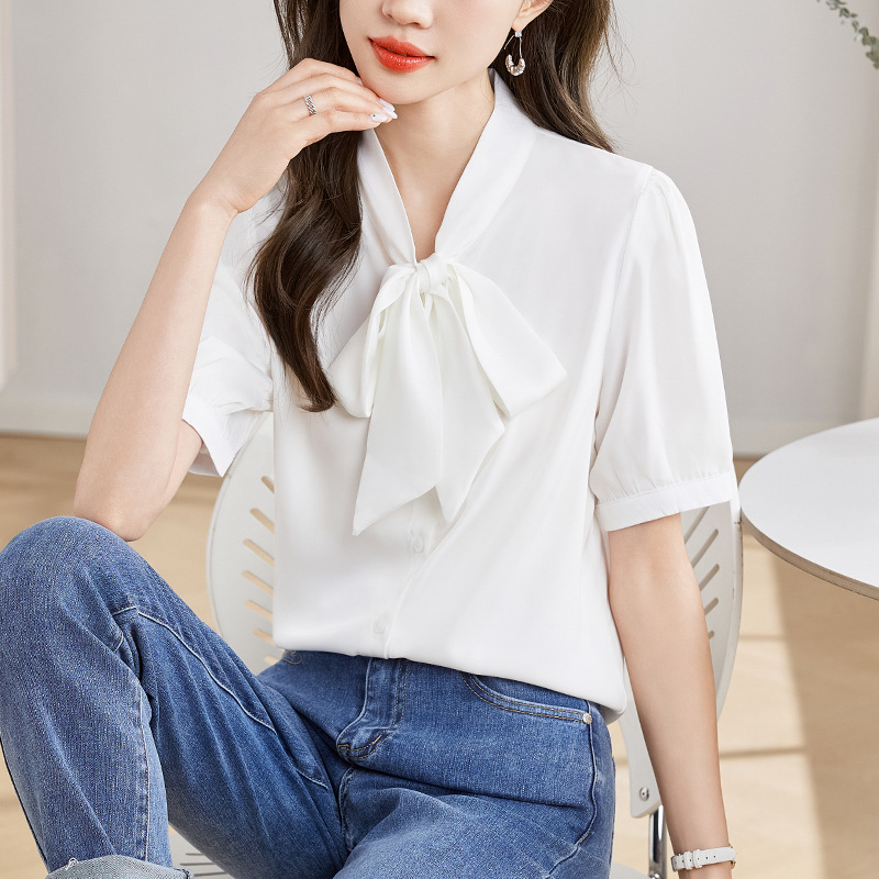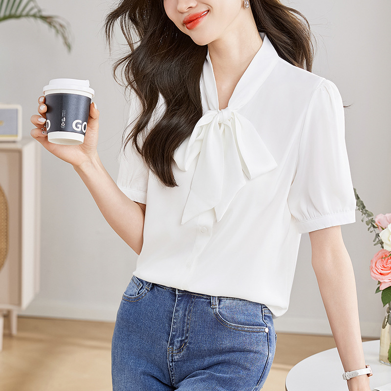 White Satin Ribbon Shirt Women’s Short-sleeved Summer Design Sense Niche Hong Kong Style Commuter Professional Top All-match Lace-up