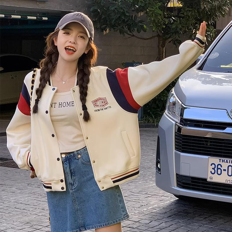 White short baseball jacket for women Spring and Autumn 2023 new preppy style unique loose stitching jacket