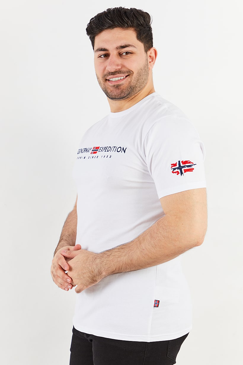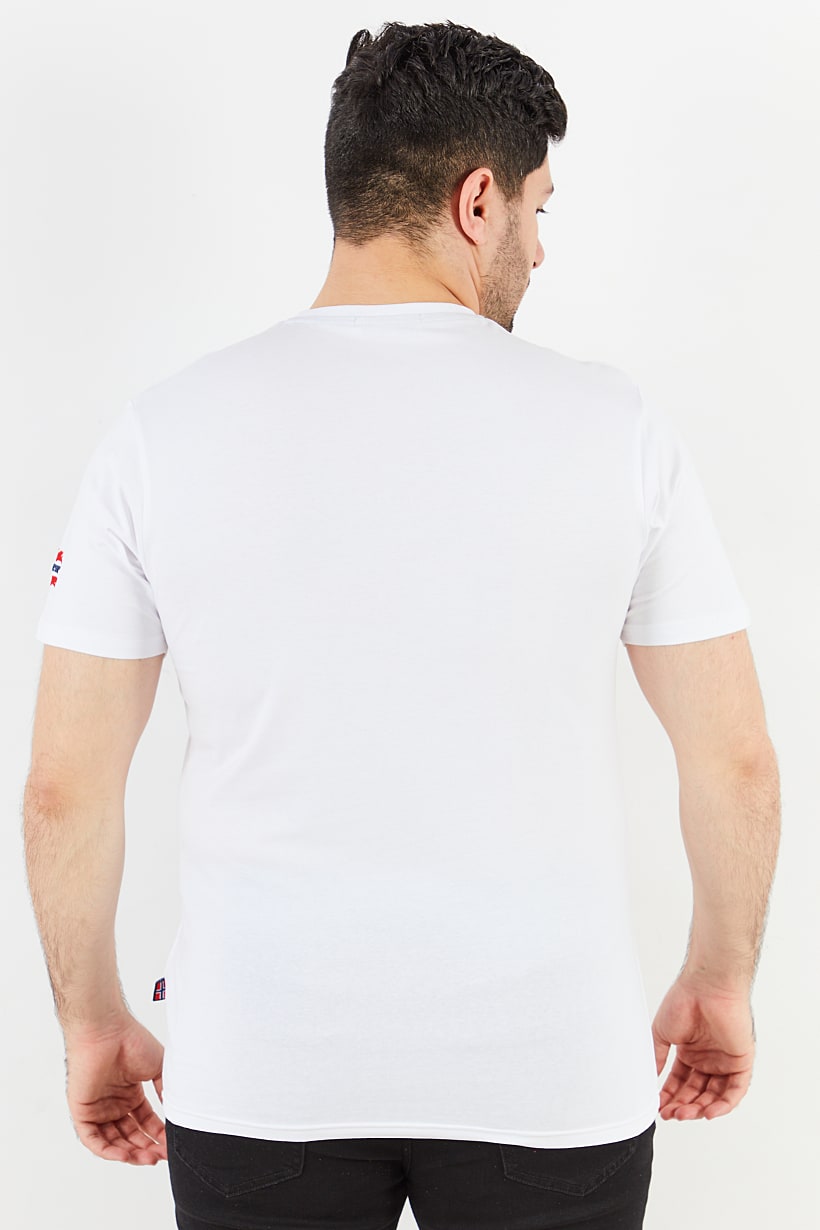 Care : Machine washable, Fit : Regular fit, Size shown : International, Sleeve Length : Short Sleeve, T-Shirt Style : Crew Neck, Type of Hem : Straight hem , Type of Neckline & Collar : Crew neckline , Fabrics : 100% Cotton, Occasion : Casual, Pattern & Print : Embroidered logo, Types of Closures : Pullover, Color Family : White,