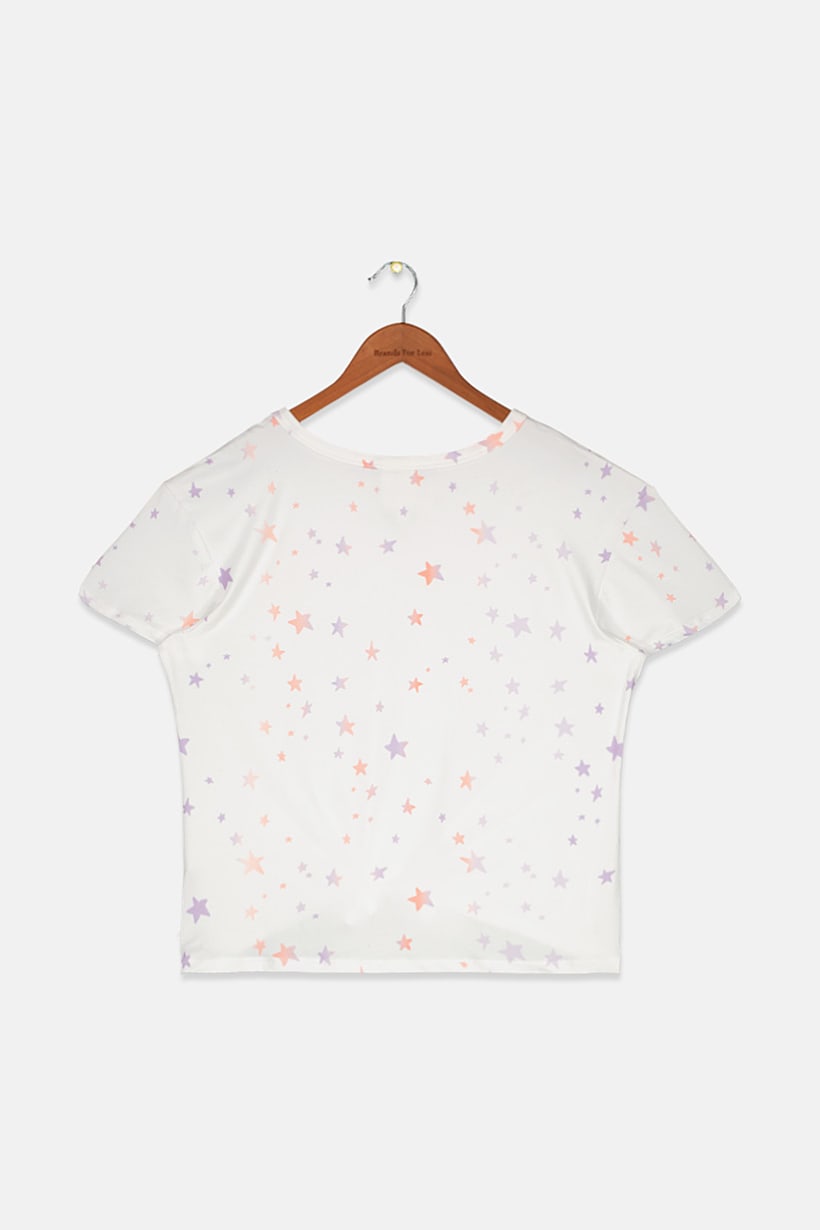 Care : Machine washable, Ideal For : Girls, Sleeve Length : Short Sleeve, Types of Hem : Tie hem, Types of Neckline & Collar : Crew neckline, Types of Sleeve : Short sleeve, Disclaimer : Product color may slightly vary due to photographic lighting sources or your monitor settings., Fabrics : 92% Polyester, 8% Spandex, Occasion : Casual, Pattern & Print : Allover print, Types of Closures : Pullover, Color Family : White,