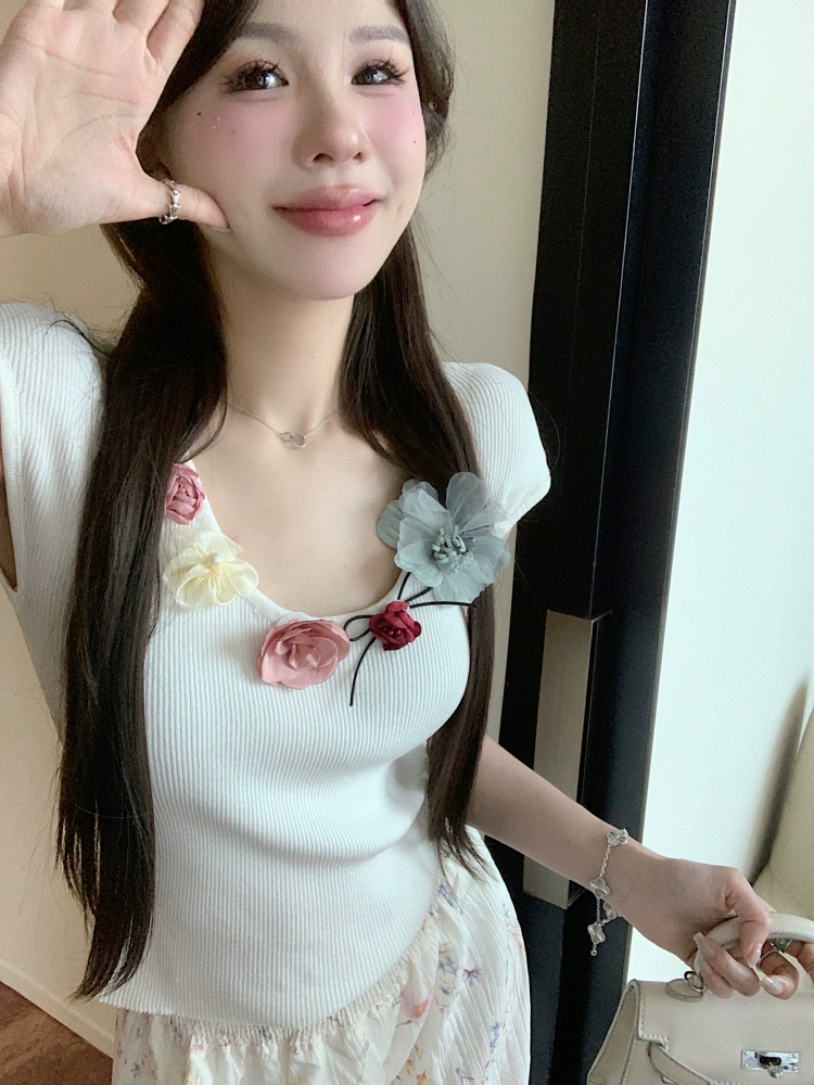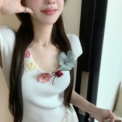 nameOriginal | White short-sleeved slim fit summer slimming design with flowers |