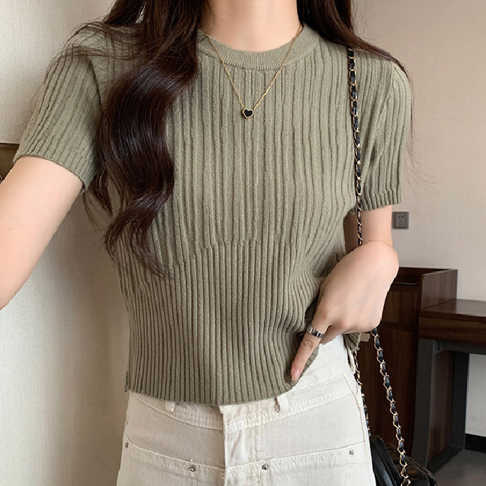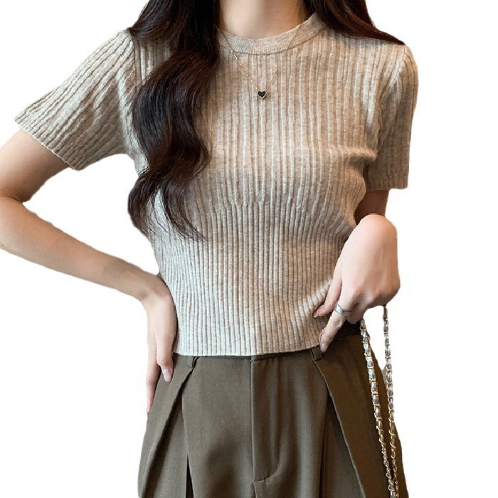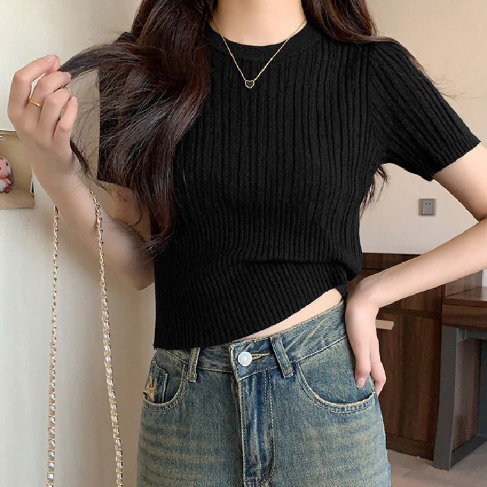| nameOriginal | White Shoulder Short-sleeved Knitwear Women's Summer New Round Neck Slim-fit Slimming Spice Girls Short Inner Top INS |