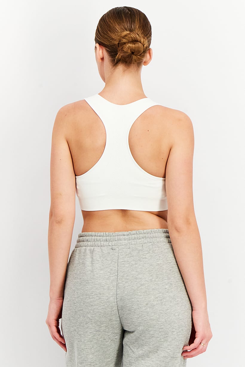 This sports bra is designed for women with a sportswear fit and is ideal for training. It features a sleeveless design with a round neckline and straight hem. The bra is made of 95% Polyamide and 5% Elastane, with a light thickness and textured pattern. It is machine washable and has a pullover closure. Please note that due to hygiene reasons, no returns are accepted on lingerie, socks, undergarments, and swimwear. The color of the bra is white and the size shown is international. It is perfect for any sport occasion.