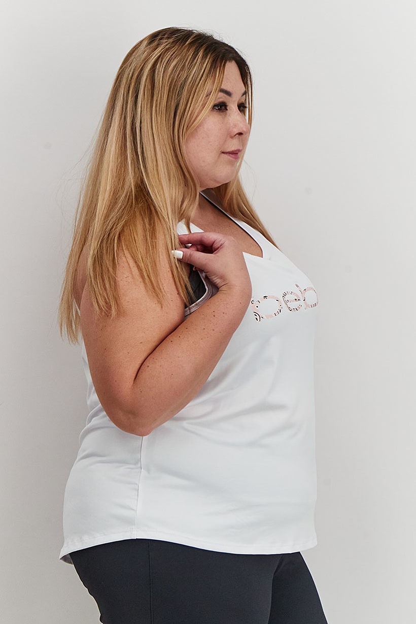 White Sleeveless Top with Brand Logo for Plus Size Women’s Sports Fit.