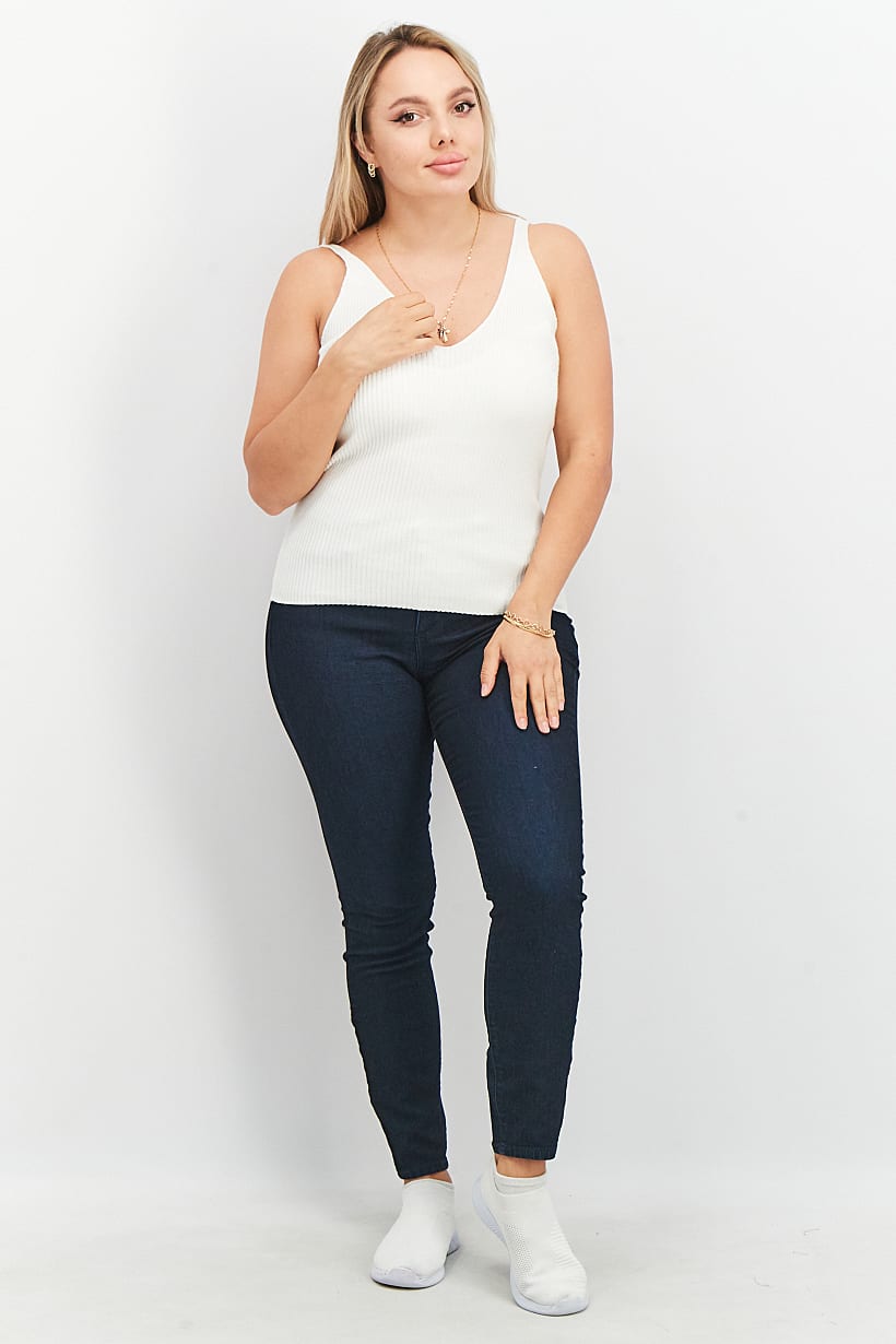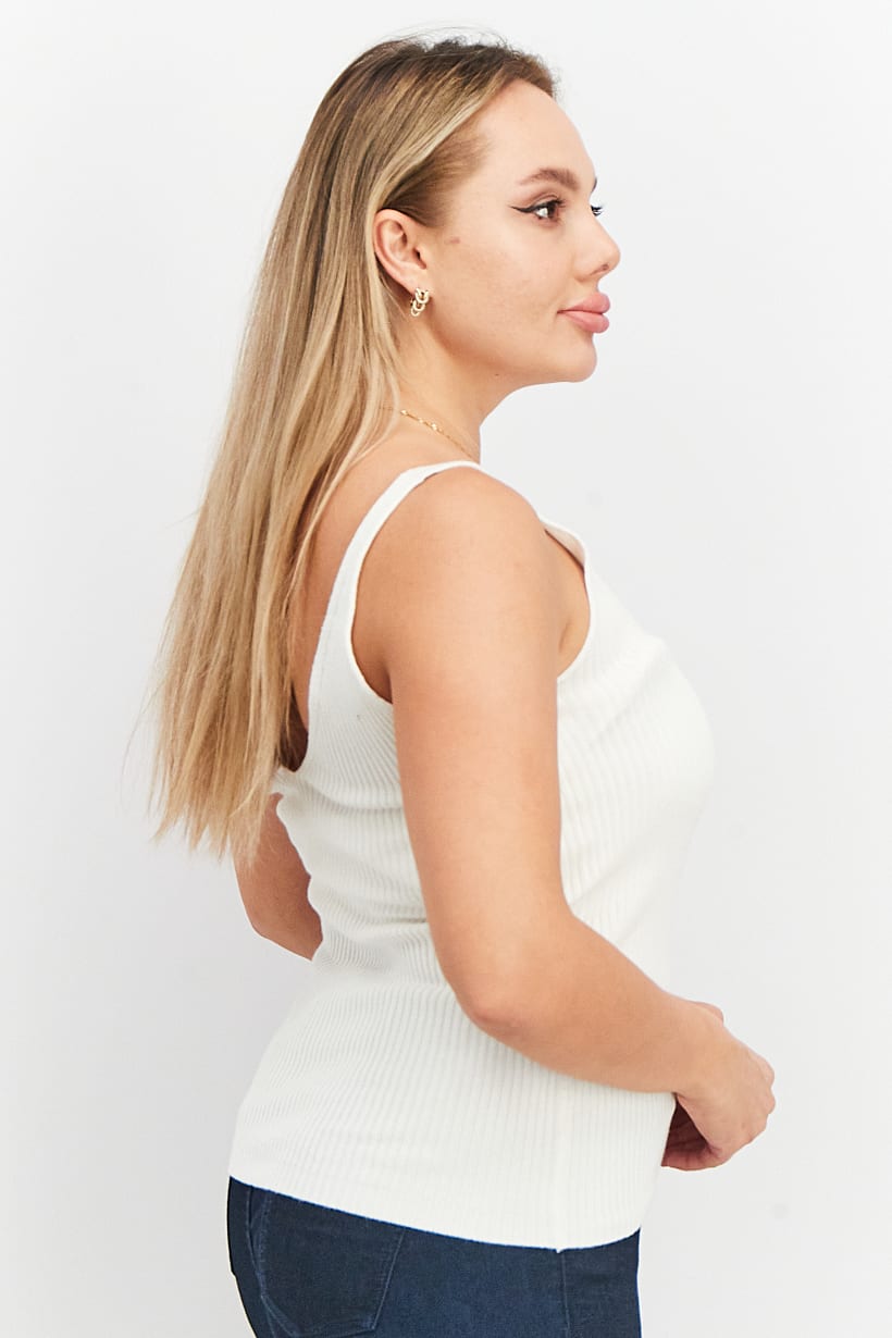 This tank top has a regular fit and a V-neckline with a ribbed hem. It is made of 70% viscose and 30% polyamide, making it perfect for casual occasions. The top is sleeveless and has a pullover closure. Please note that the product color may vary slightly due to lighting or monitor settings. The pattern and print are plain/solid, and the color family is white. To maintain the quality of the top, it is recommended to hand wash it. The size shown is international.