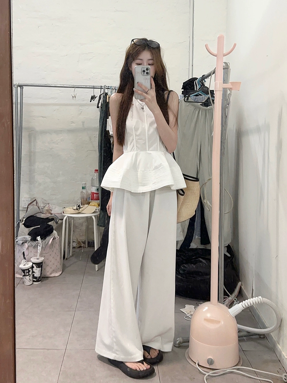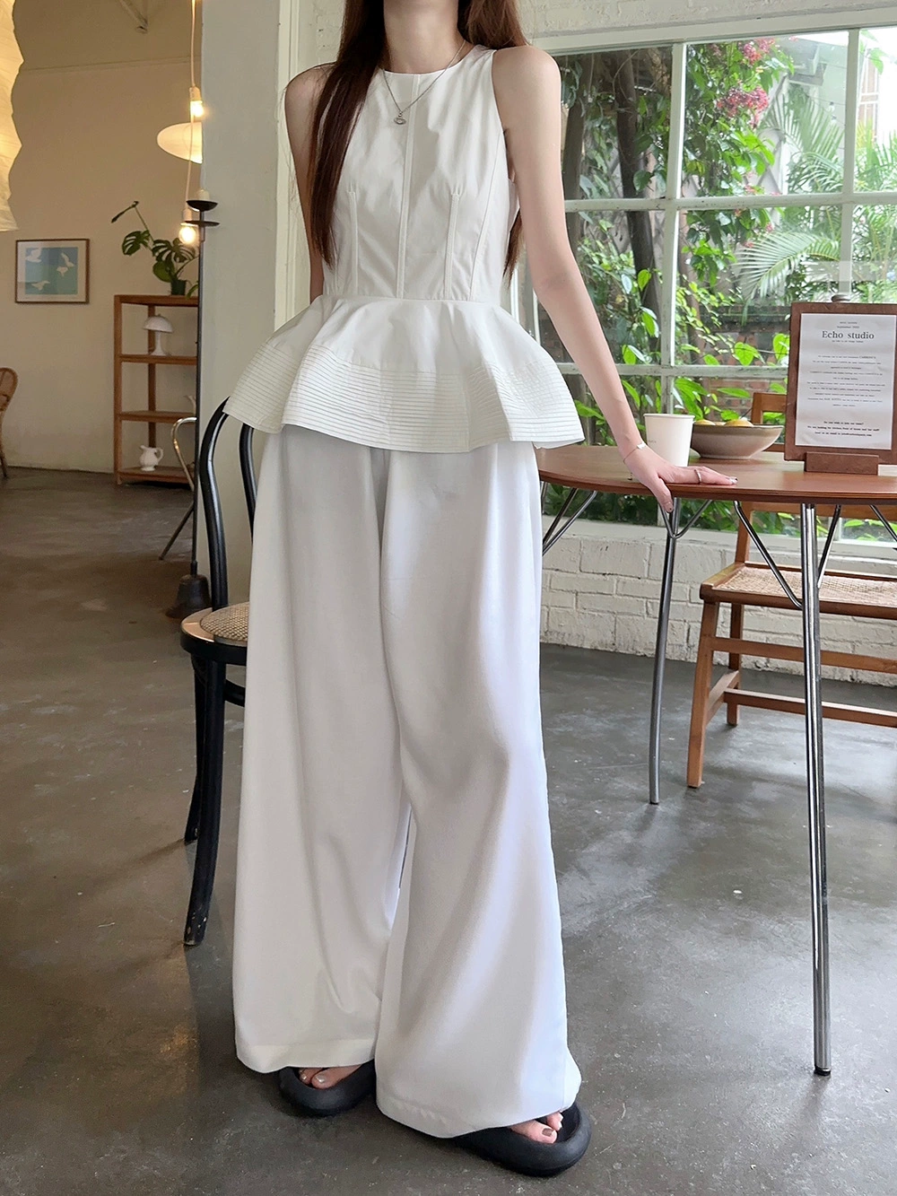 | nameOriginal | White Slim Fit Sleeveless Ruffled Round Neck Tank Top |