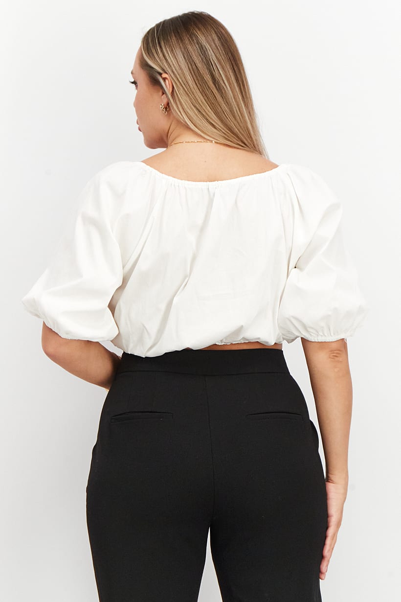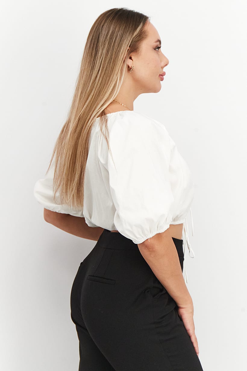 Care : Machine washable, Fit : Regular fit, Size shown : US, Top Style : Cropped, Types of Hem : Elasticized hem, Types of Sleeve : Balloon sleeve, Fabrics : 68% Cotton, 29% Polyamide, 3% Spandex, Occasion : Casual, Pattern & Print : Plain/Solid, Types of Closures : Tie closure, Color Family : White, Types of Neckline & Collar : Tie neckline, Disclaimer : Product color may slightly vary due to photographic lighting sources or your monitor settings.,