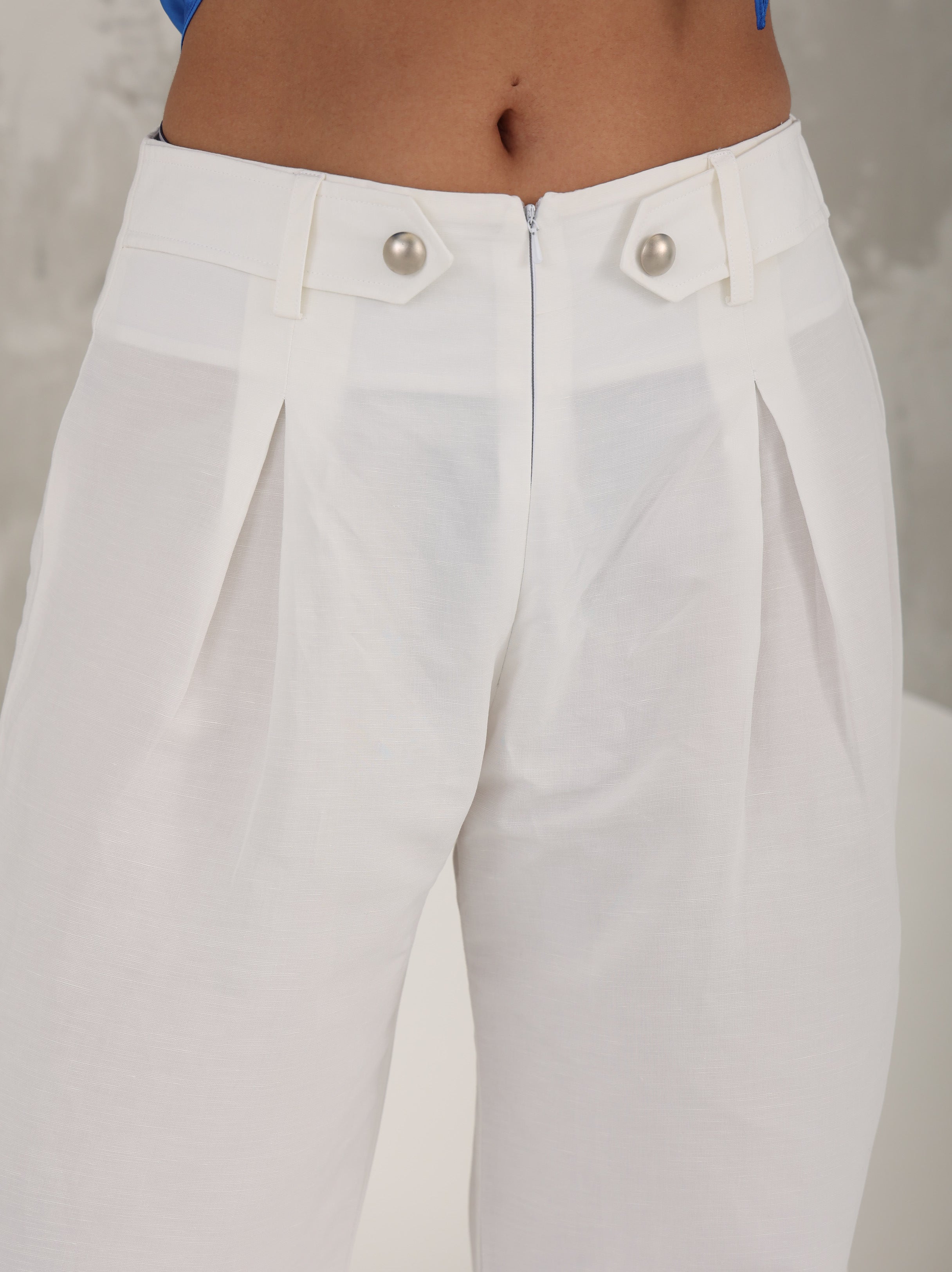 Elevate your late summer days style with our Crisp White Summer Slacks Crafted from pure white linen, these pants exude a timeless, breezy elegance. The stylish front zipper closure, adorned with buttons on each side, adds a touch of sophistication to these wide-leg Trousers. Perfect for both casual and dressy occasions, these pants are the epitome of comfort and style, making them a must-have addition to your summer wardrobe.