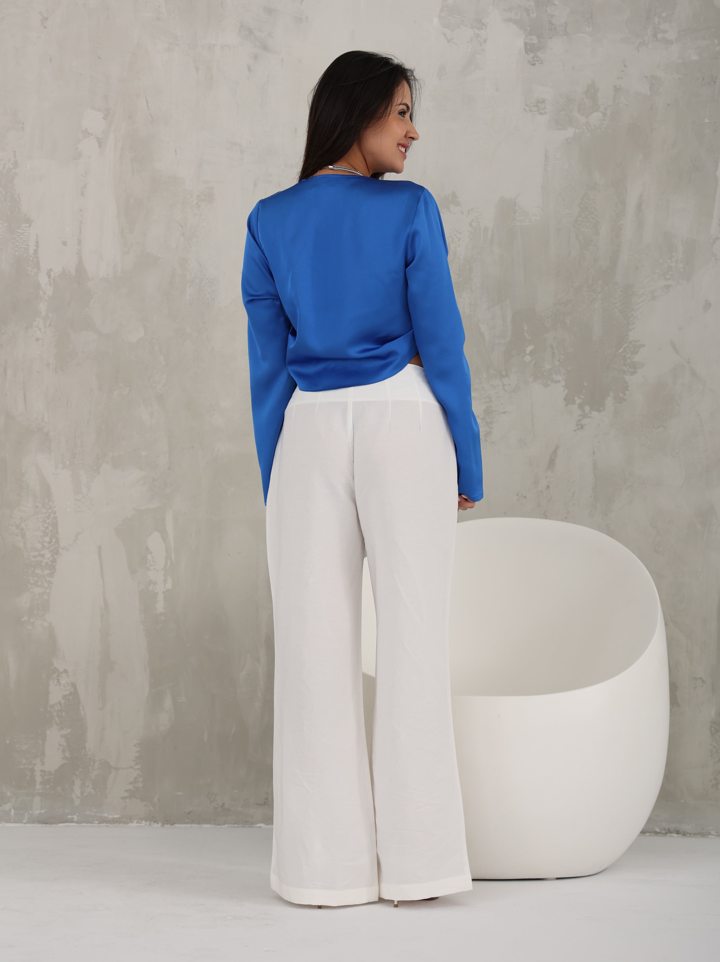 Upgrade your late summer wardrobe with our Crisp White Summer Slacks. Made from pure white linen, these pants offer a timeless and airy elegance. The front zipper closure, embellished with buttons on each side, adds a touch of refinement to these wide-leg trousers. Whether you’re going for a casual or dressy look, these pants are the perfect combination of comfort and style, making them an essential addition to your summer closet.
