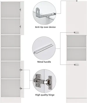 [Premium Quality Material]: Made from high-quality P2 level MDF boards, this storage cabinet is built to last and features durable silver handles and door hinges. It comes with an anti-tip kit to prevent tipping and ensure stability. The brushed finish surface adds a touch of refinement to your space.