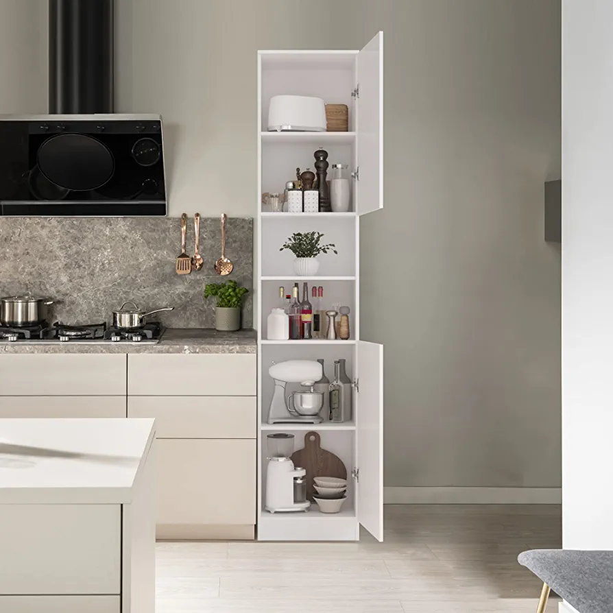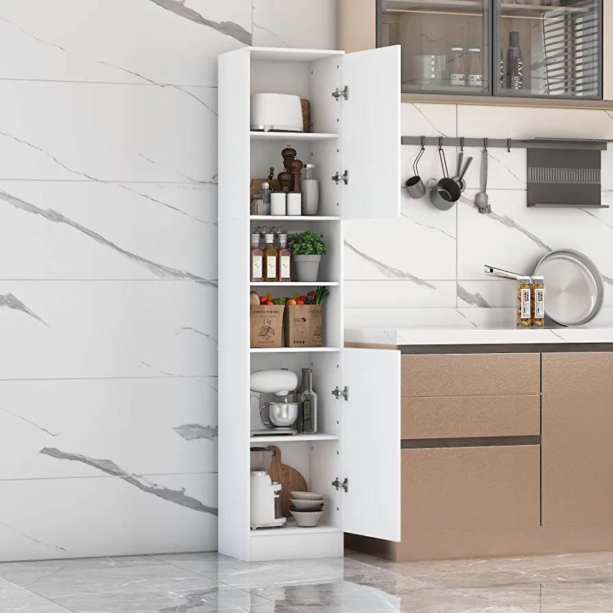 White Tall Pantry Cabinet with Cupboards & Adjustable Shelves for Kitchen, Bathroom, Living Room, Bedroom, or Office Storage.