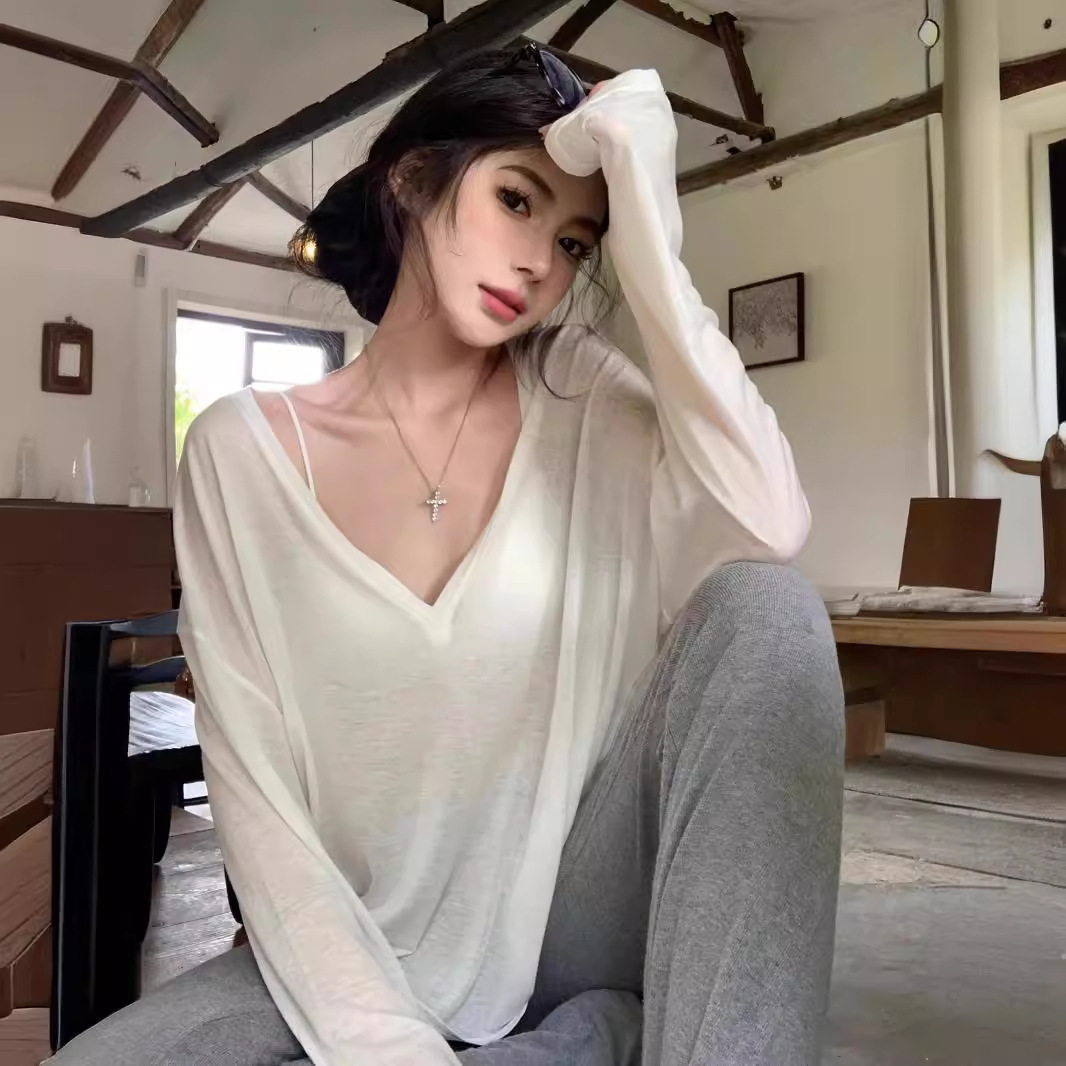 | nameOriginal | White Thin Micro-transparent V-neck Long-sleeved T-shirt Women's Summer Loose Sun Protection Blouse Casual Lazy Style Overalls |