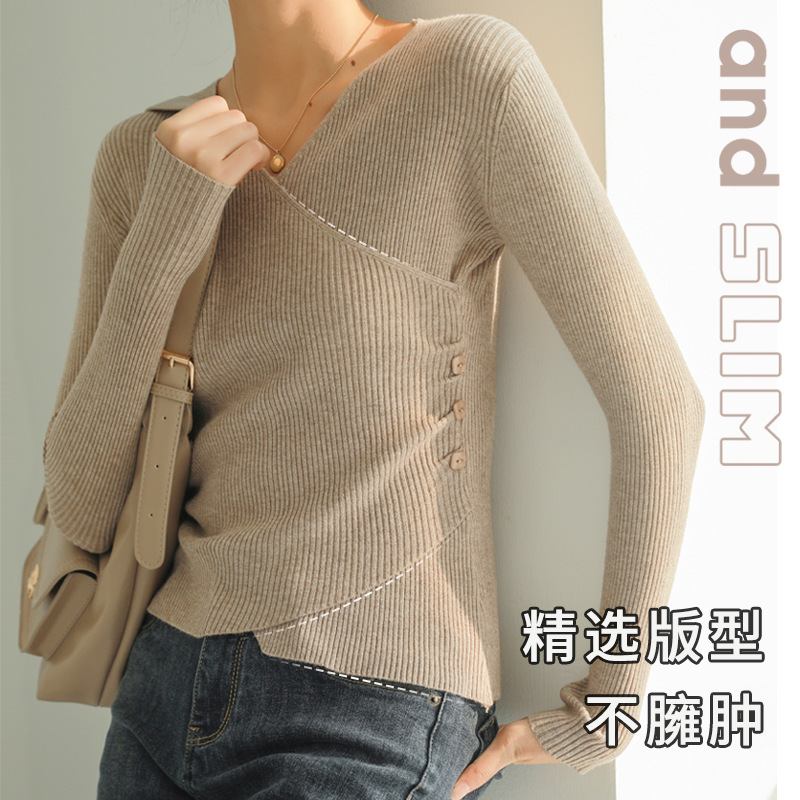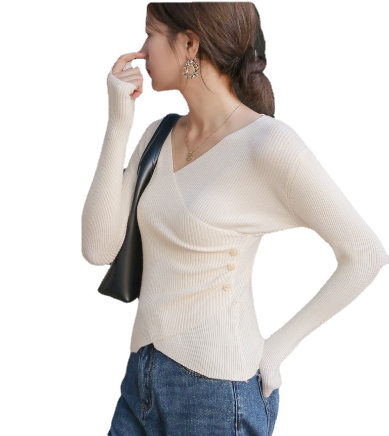 White V-neck Fashion Stylish Base Shirt Women’s Spring Autumn and Winter Cashmere Long-sleeved All-match Sweater Knitted Shirt