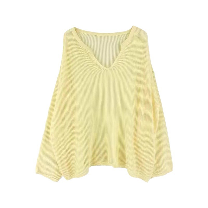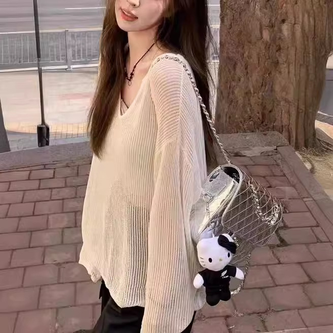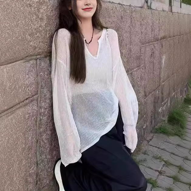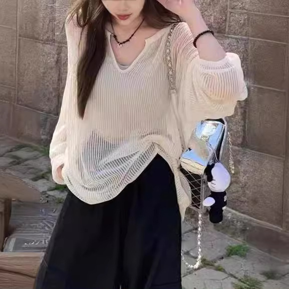 | nameOriginal | White V-neck Hollow Ice Silk Knitted Sweater Women's Summer Thin Outer Sunscreen Air Conditioning Blouse Solid Color Micro-transparent Top |