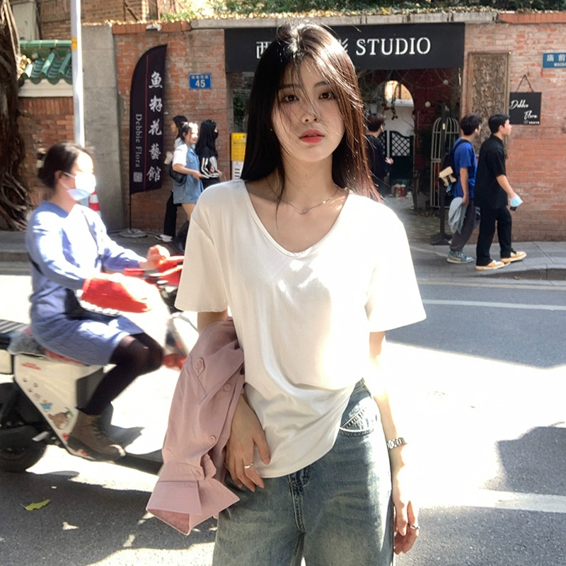 | nameOriginal | White V-neck right shoulder versatile high-end short-sleeved T-shirt |