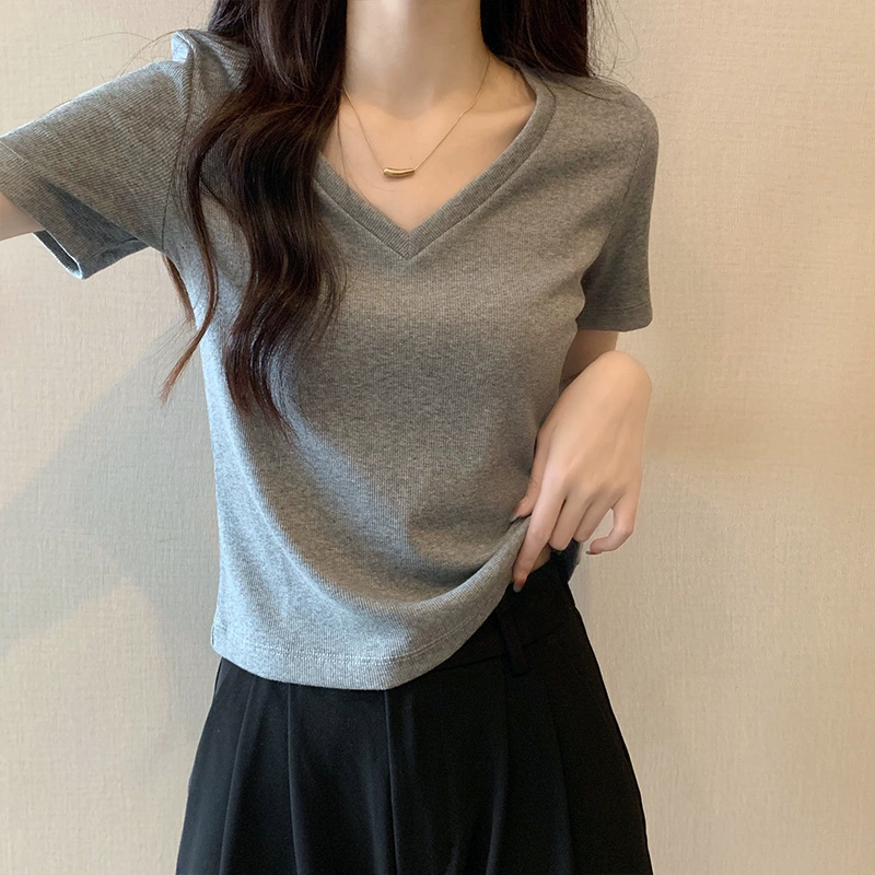 | nameOriginal | White V-neck slimming elastic threaded short-sleeved T-shirt |