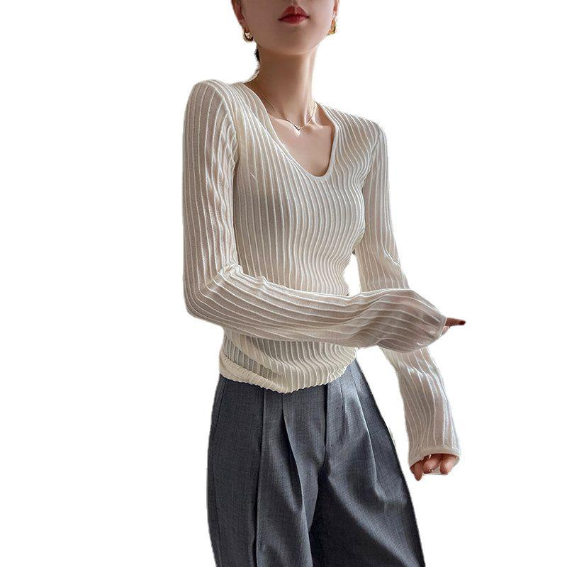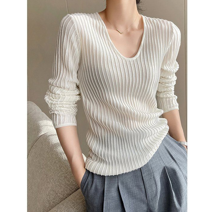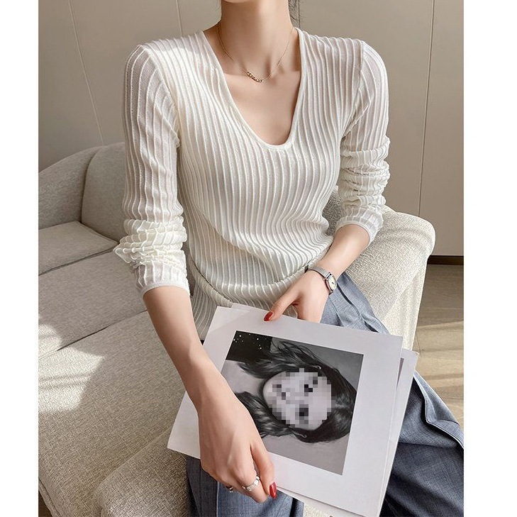 | nameOriginal | White V-neck vertical grain long sleeve knitted T-shirt women's 2024 spring new solid color simple temperament fashion inner top |