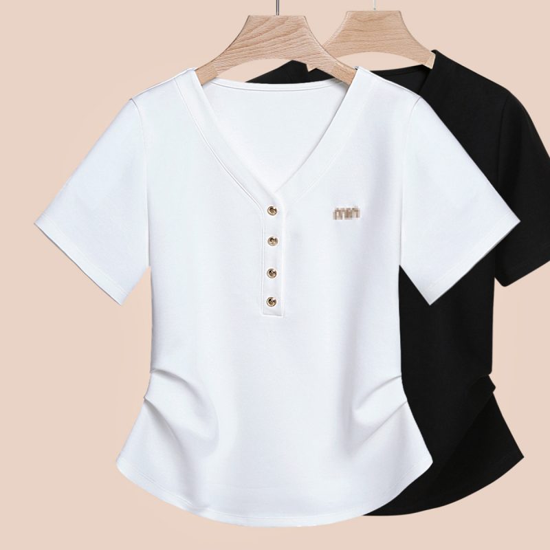 nameOriginal | White Women's 2024 Summer New Design Sense V-neck Irregular Curved Hem Korean Style Short Sleeve T-shirt Women's Half Sleeve |