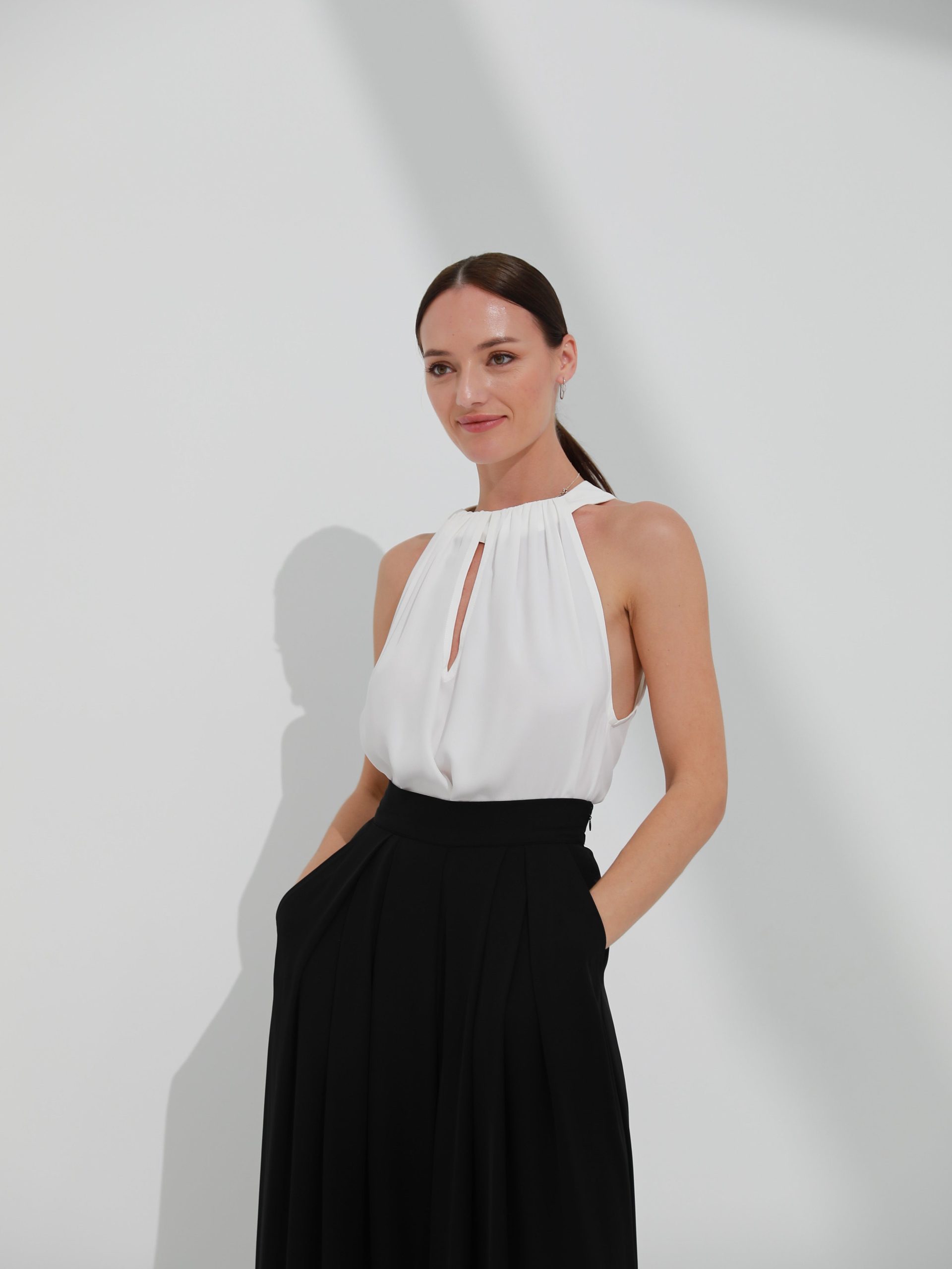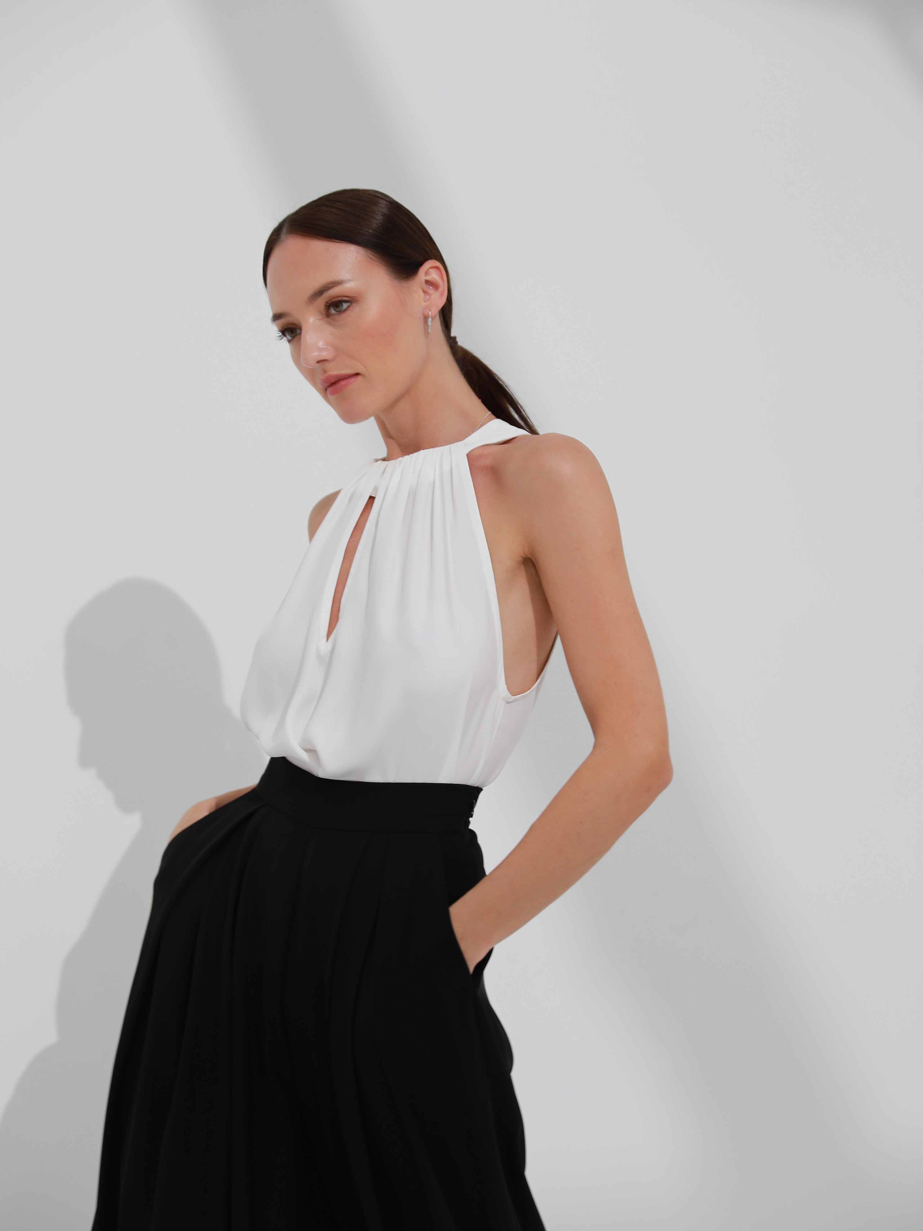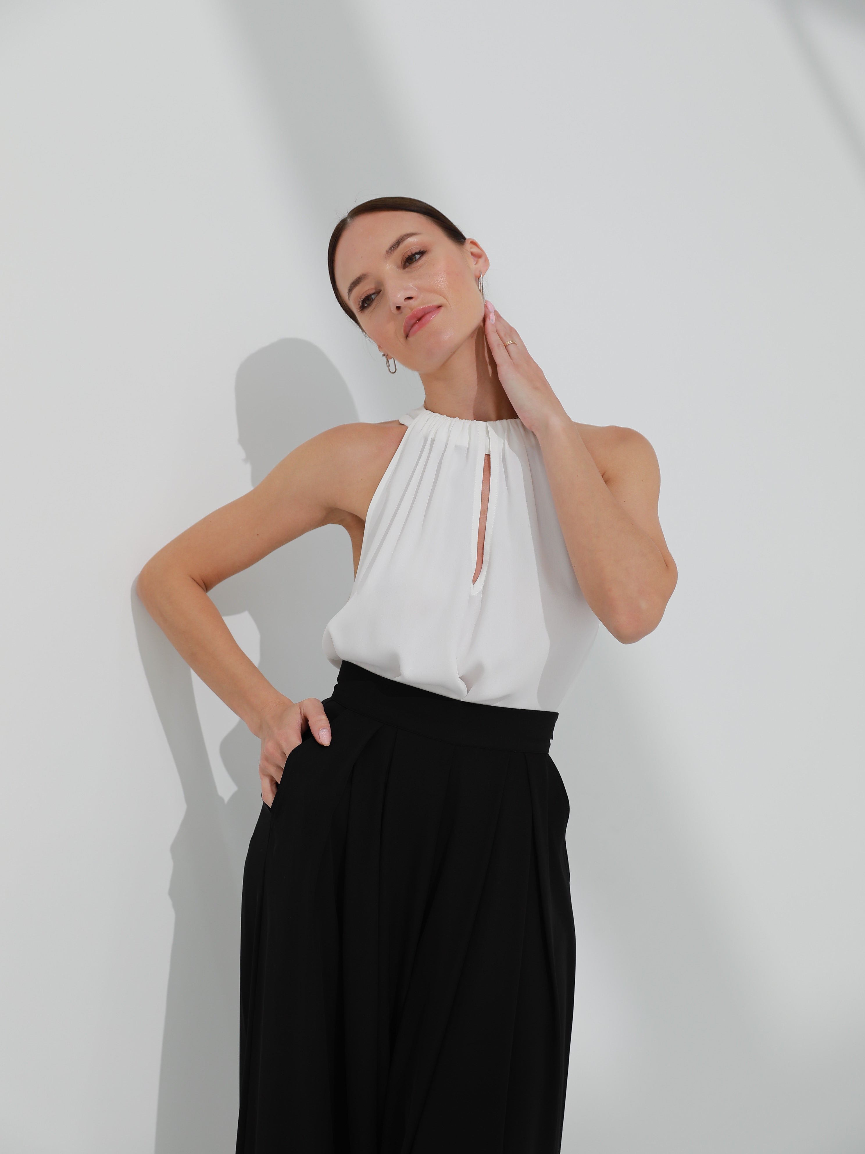 This product is a sleeveless blouse made of white chiffon fabric. It features delicate buttons at the back for a secure and elegant closure. The design includes a unique slit detail in the front, which adds a touch of elegance. This blouse is classic and versatile, making it suitable for any occasion and can be easily dressed up or down.