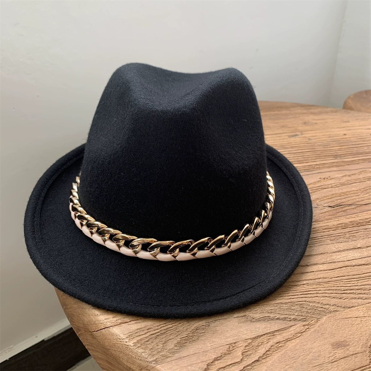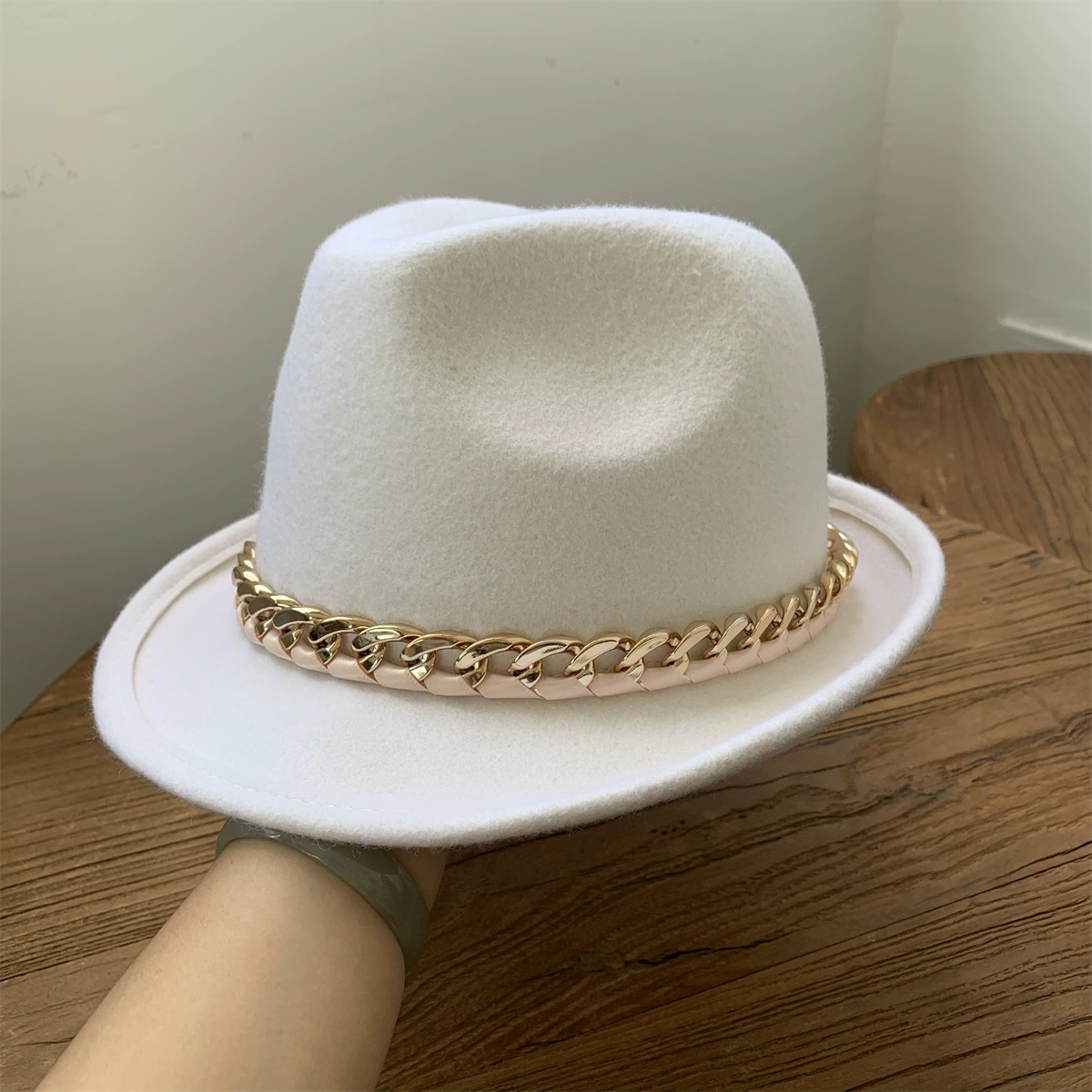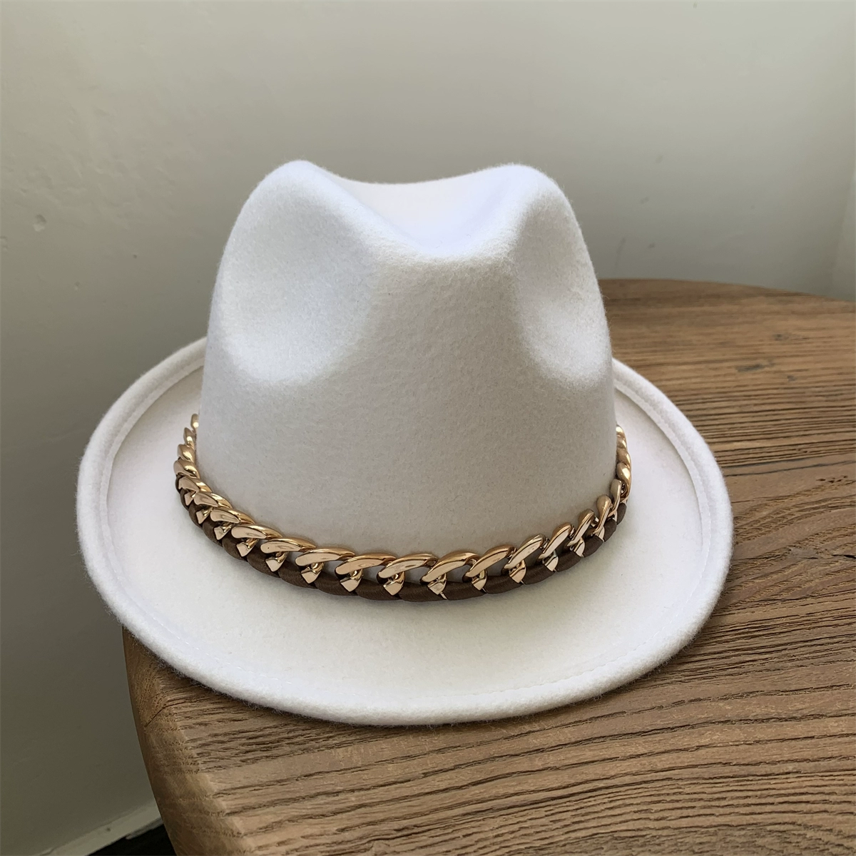 | nameOriginal | White wool felt hat for women, retro curled top hat, chain jazz hat for men, autumn and winter British felt hat, versatile |