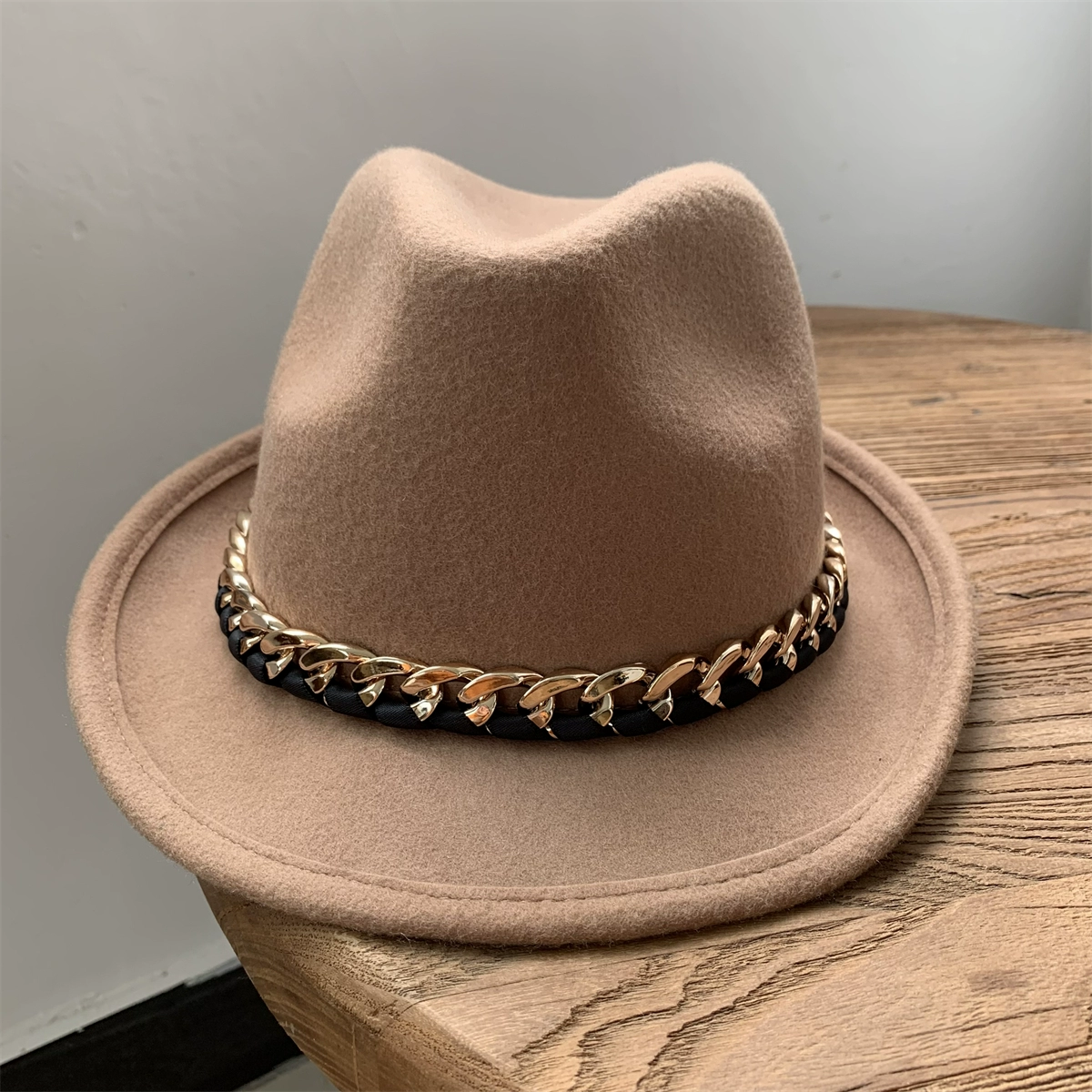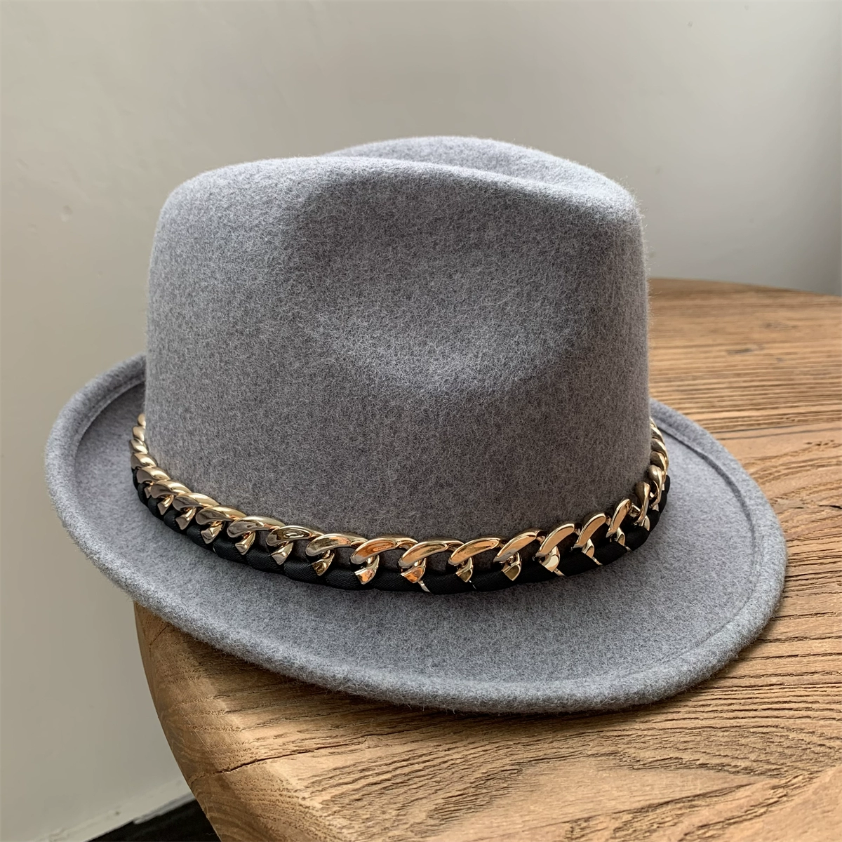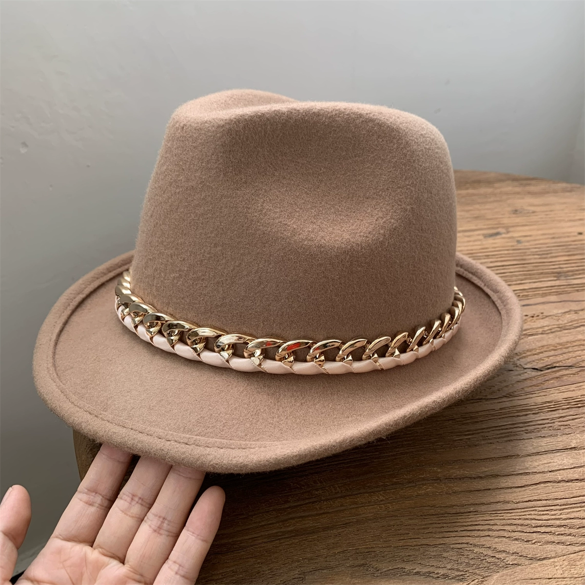 | nameOriginal | White wool felt hat for women, retro curled top hat, chain jazz hat for men, autumn and winter British felt hat, versatile |