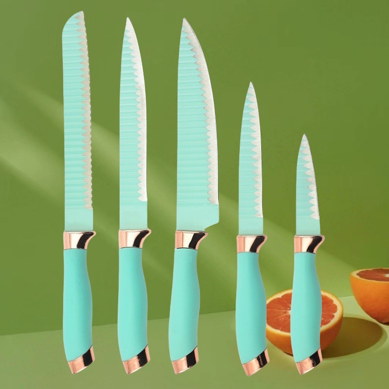 | nameOriginal | Wholesale cross-border green double plating head handle wavy five-piece stainless steel kitchen knife single-pole double-sided suction |
