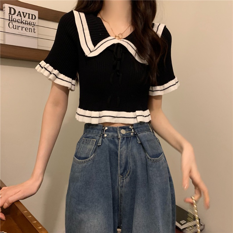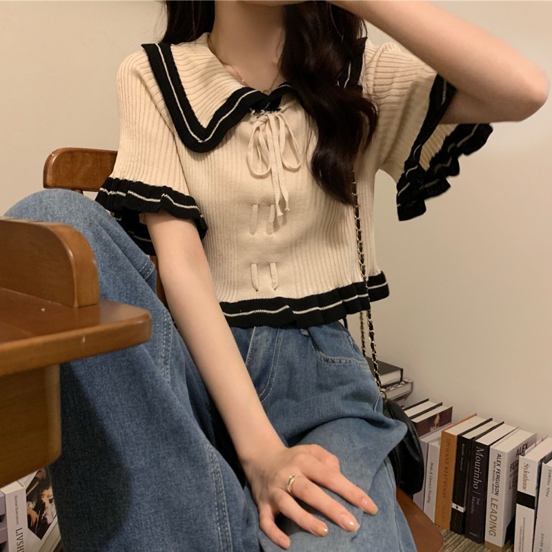 Wholesale Design Sense Niche Ruffled Doll Collar Sweater Short-sleeved T-shirt Women’s Summer French Chic Short