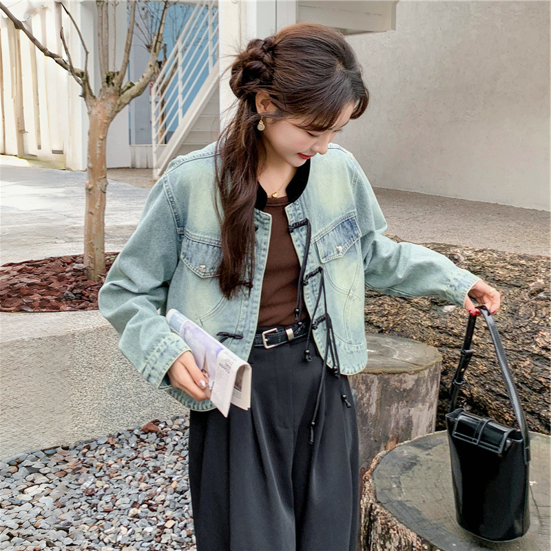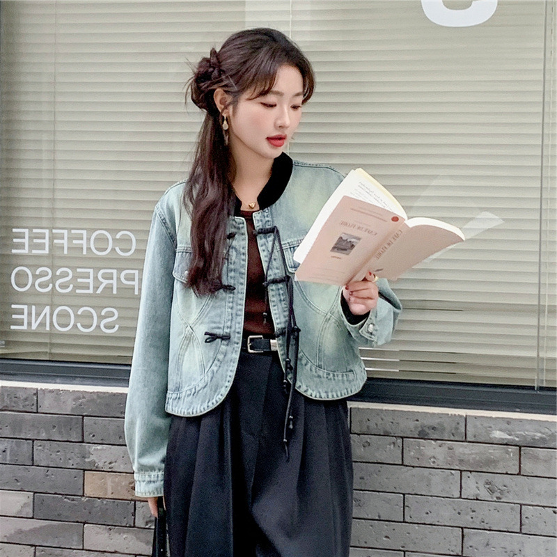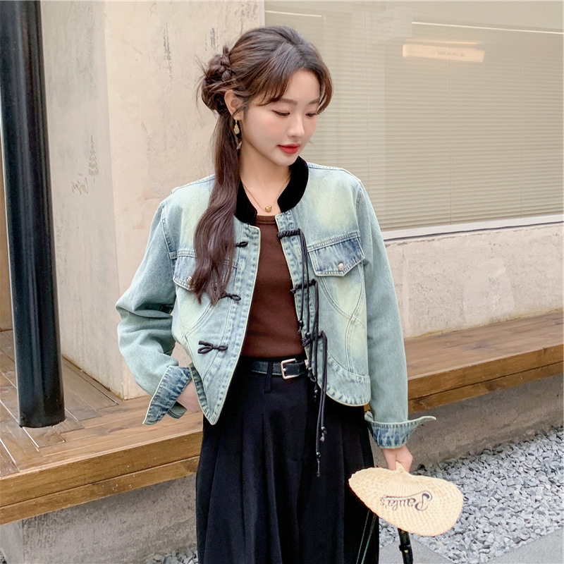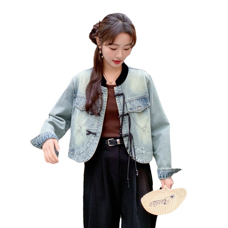 | nameOriginal | Wholesale small age-reducing versatile color matching stand collar straight slimming Chinese style new Chinese style buckle Denim short coat for women |
